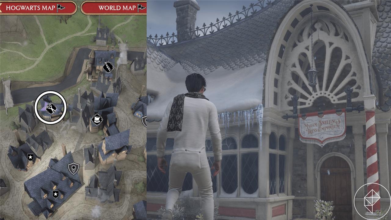 Travel to Madam Snelling’s Tress Emporium in Hogsmeade (marked by scissors on the map, available after early missions).