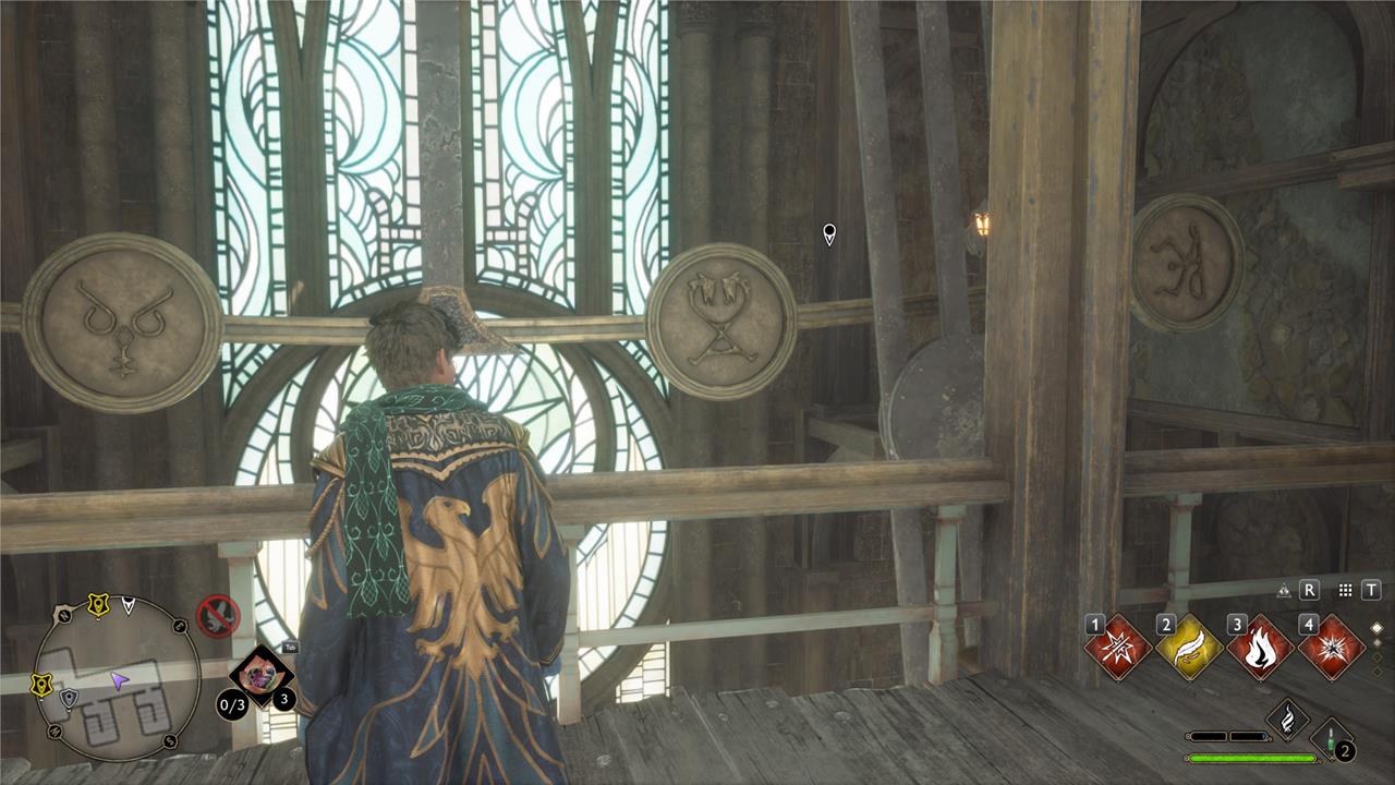 Stop the clock over the second symbol, the one that resembles an owl, and run left to the end of the balcony. Cast your disillusionment charm, enter the door, and open the eye chest.