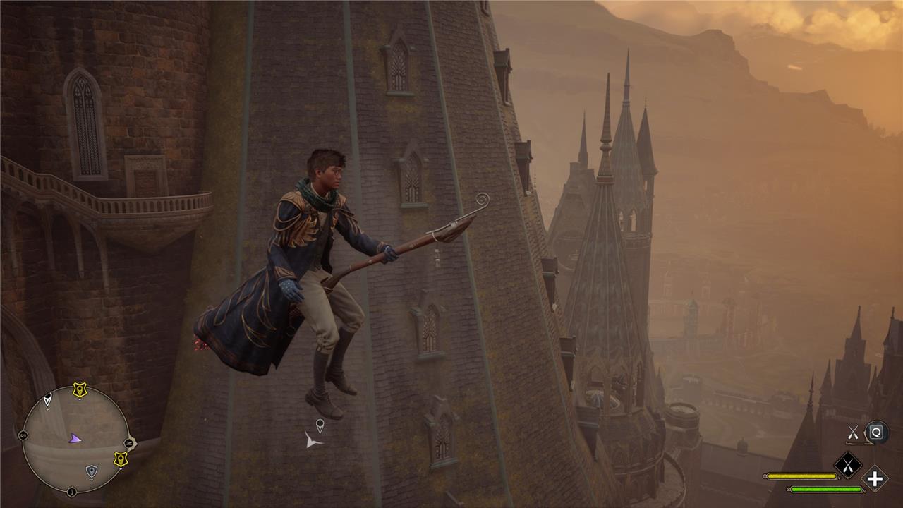 Hop on your broom or mount, and fly up to the tallest tower where the headmaster’s office is. It’s beyond the Grand Staircase and at the opposite end of the castle from the Quidditch pitch. A small walkway runs along the outside of the tower, and while you can land on it, you may encounter some problems. I had issues landing near the door and a glitch that kept pushing my broom down.