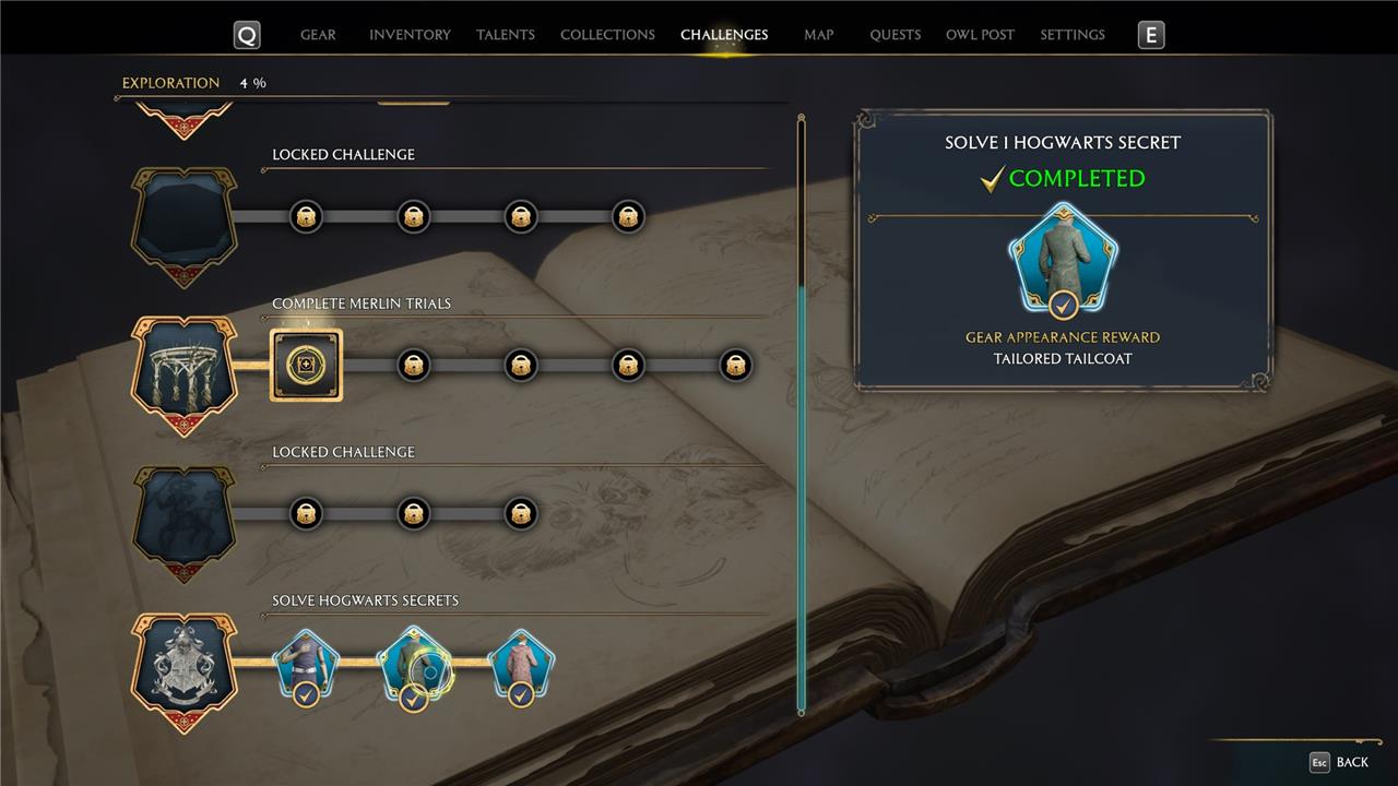 Hogwarts’ Secrets occupy a section in your field guide under the “Challenges” section. There are three secrets in total, and completing them earns you field guide progress, three unique outfits, and a bundle of randomized loot you can identify in the Room of Requirement.