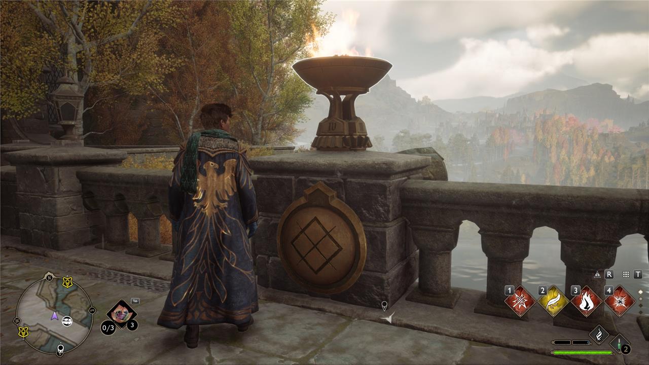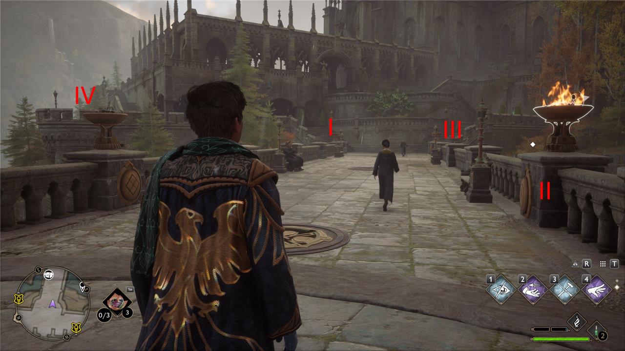 The Viaduct Bridge puzzle in Hogwarts Legacy features four stone braziers placed around a symbol plate on the bridge. Each brazier has a Roman numeral that must match the symbol carved on the plate nearby. Light all four braziers with the Incendio or Confringo spell, rotate their dials to align the symbols with the correct numbers, and the hatch in the bridge will open, revealing a hidden chest filled with rewards.