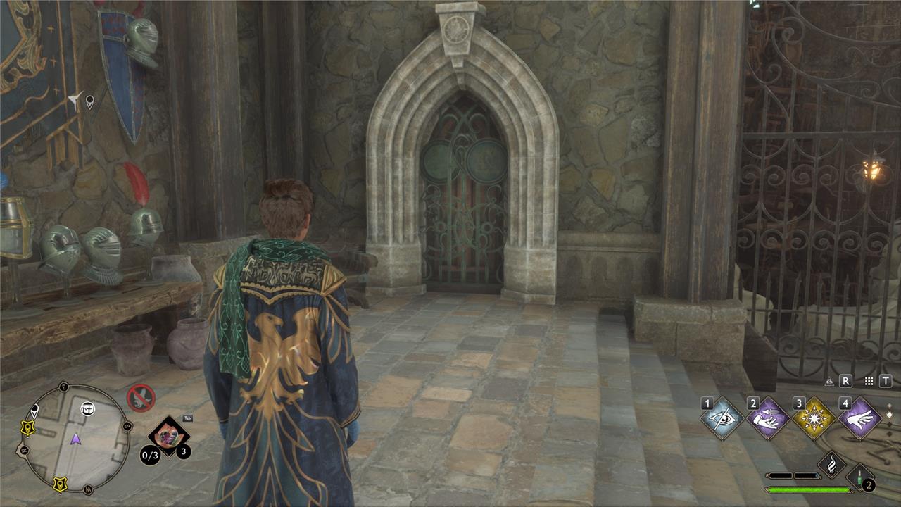 Solving the Clocktower puzzle lets you get through the doors with metal grates that shut before you can open them. You need the Glacius spell or Arresto Momentum, both of which you get from completing Madam Kogawa’s assignments and popping balloons on a broom. You also need Alohomora at level one, so make sure to finish Gladwin Moon’s story quest if you haven’t already.