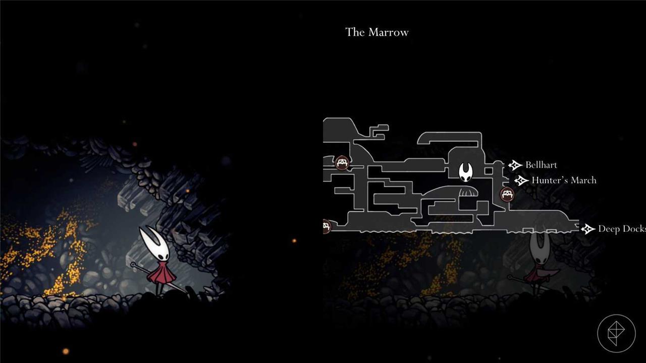 Once you reach the chamber shown above in The Marrow, destroy the glowing spot on the wall below the red flowers to open a passageway. Follow it to the end (carefully, as there’s a spike pit at the bottom), and grab the metal at the end of the tunnel.