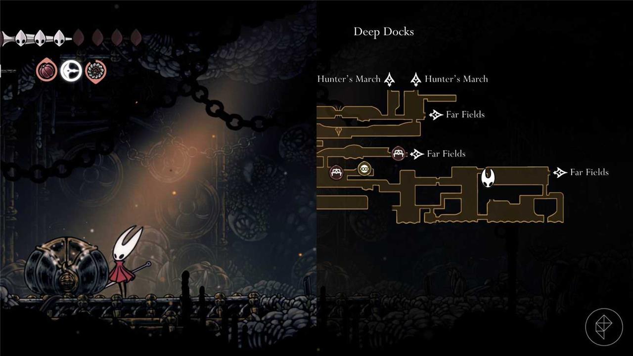 Enter Deep Docks via the lower Far Fields entrance, and instead of dropping down to collect the spool fragment (though if you have the Faydown Cloak and Clawline, you should go ahead and get that), go to the left. Smash the wooden supports under the platform to clear the way, enter the next chamber, and get the metal from the chest inside. A flying enemy throwing explosives will follow you in, so don’t let your guard down.