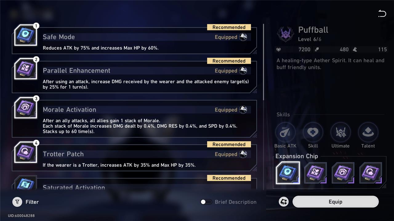 We set up our spirits with the following chips, but you don’t really need all of these immediately, so don’t stress if you don’t have them when you’re looking through your inventory. Just use what you have and swap them out with the below chips once you get them: