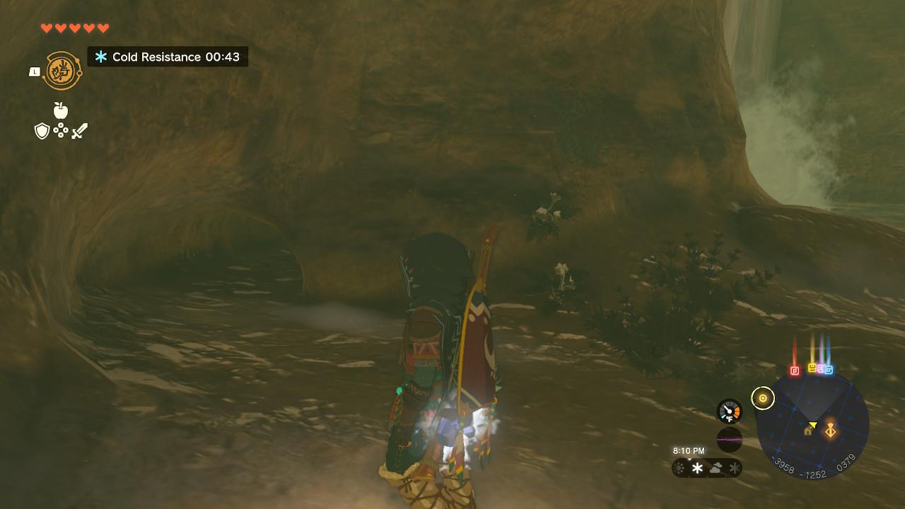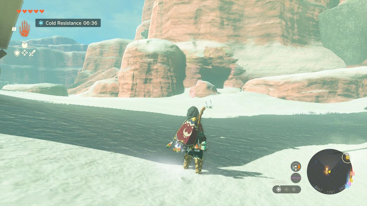 For cold resistance, I used the Archaic Warm Graves, which you can obtain in the Great Sky Island at the beginning of the game, as well as spicy sautéed peppers, which I cooked over at the Kara Kara Bazaar. If you already have a dish with spicy peppers mixed in, you’re set.