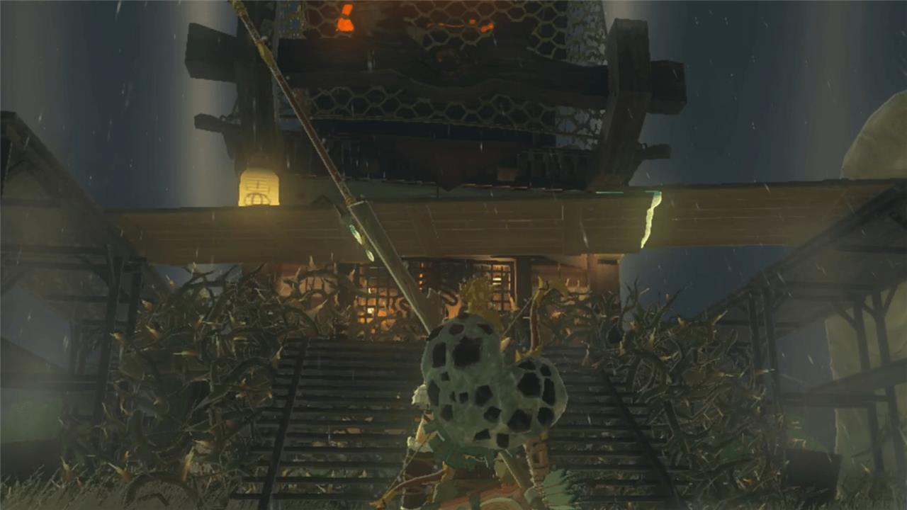 Head to the Rabella Wetlands Skyview Tower at coordinates 2419, -2762, 0222, surrounded by thorns and constant rain. Use Ascend under nearby scaffolding to reach a covered spot on the outer perimeter, then shoot a Fire Fruit at the sheltered thorns to burn them away. Enter the inner area and assemble wooden planks from Hudson Construction sites with Ultrahand into a cover over the entrance thorns, supported by side platforms; ignite them with another Fire Fruit once protected from rain. Pass through the cleared door and activate the device inside.โ