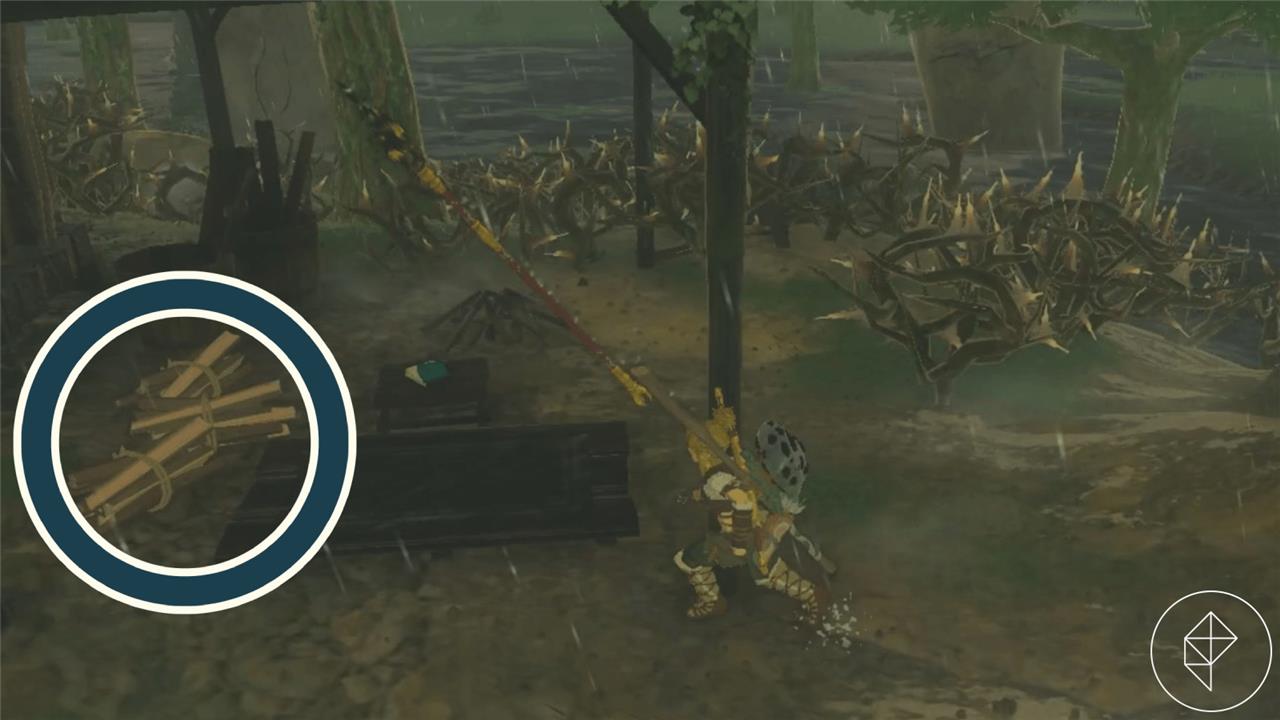 Hop off of the scaffolding into the blocked off area to find two Hudson Construction stations. Build a temporary roof by using Ultrahand to combine three of the long wooden planks lengthwise, then place it on top of the two wooden scaffolds outside of the tower’s entrance. Adjust the roof as needed to prevent the rain from touching the thorns, then set the thorns on fire with a fire fruit, a torch, or a campfire.