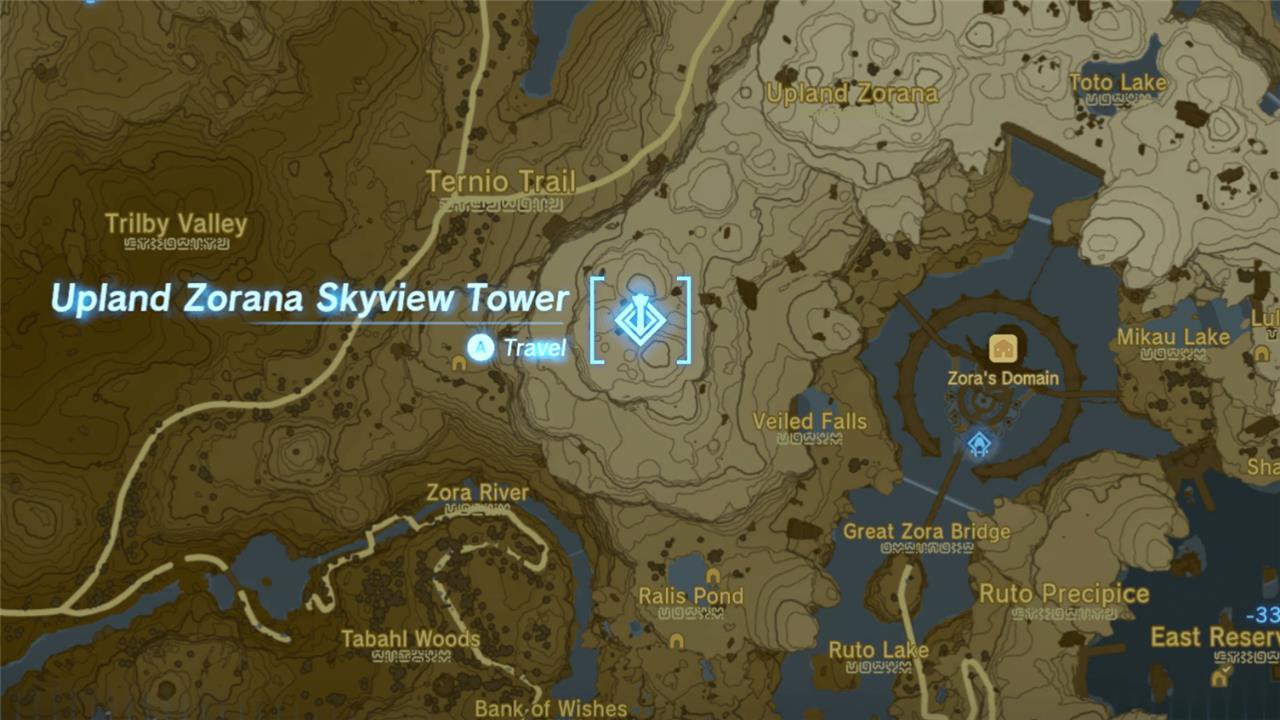 The Upland Zorana Skyview Tower is located to the west of Zora’s Domain in the Lanayru region at the coordinates (2857, 0582, 0379). Make your way to the tower atop a hill to find it covered in sludge, a brown mud-like substance. To open the Upland Zorana Skyview Tower, you’ll need to wash away the sludge blocking the door.