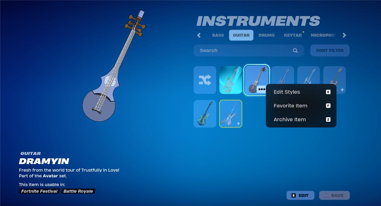 3. Within the Locker menu, navigate to the kind of cosmetic item you previously Arhived. For example, if you Archived a Guitar, go to the Guitar section within the Instruments menu.