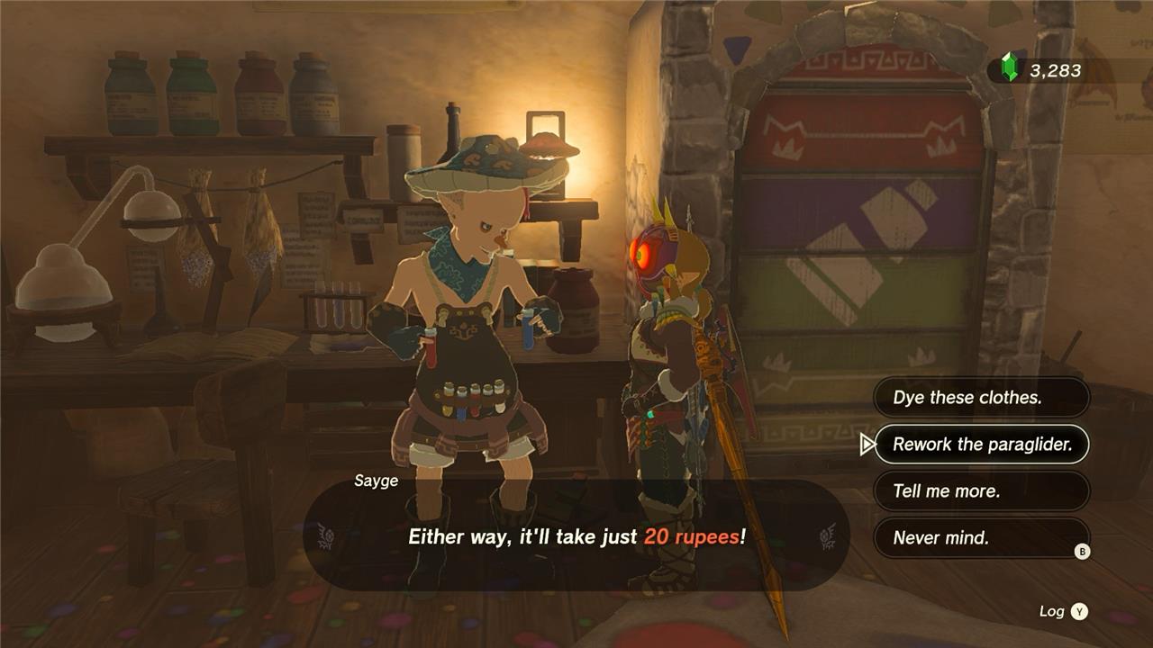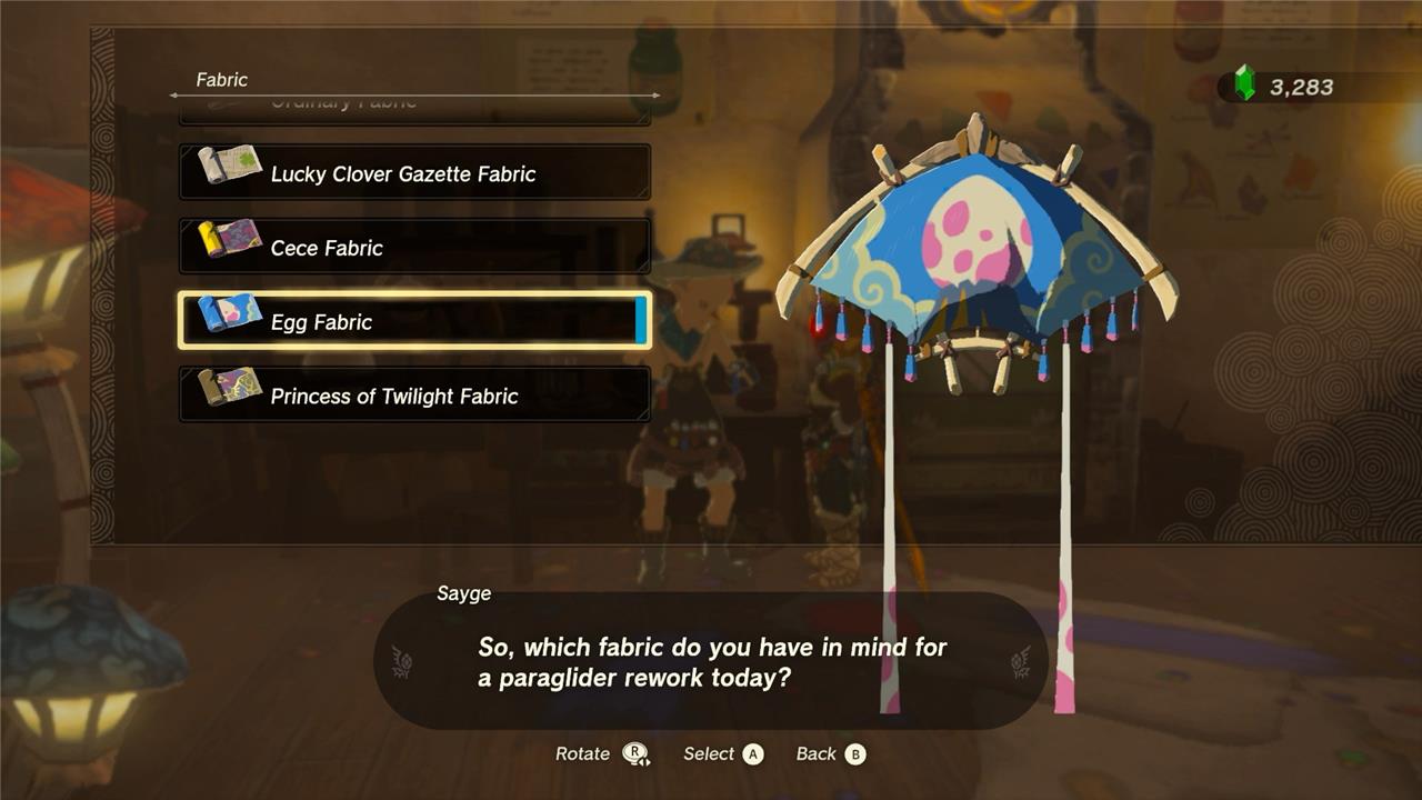 To change the design of your paraglider in Tears of the Kingdom, make your way over to Hateno Village and speak with Sayge inside the dye shop. Choose the “rework the paraglider” option to change the design of your glider at a cost of 20 rupees.