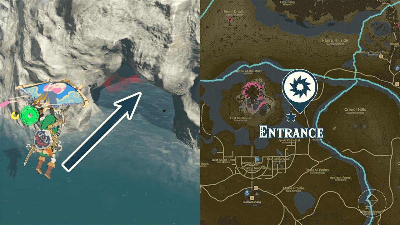 - On the southwestern corner of Hyrule Forest Park, glide off of the edge of the cliff to find a cave opening on the side of the cliff, and head inside to find the Hyrule Castle Moat East Chasm. If you’re having a hard time finding the entrance, check out the map above to see the entrance indicated by a star.