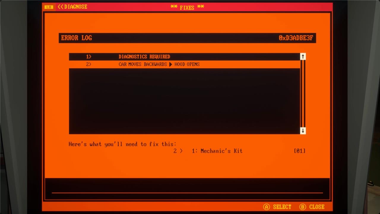 Right next to where you park in the auto shop, you’ll find the tinker station – it’s just to the right of the charging station. It’s a computer with a crossed wrench and screwdriver displayed on the screen. Interacting with it lets you diagnose your car’s quirks.
