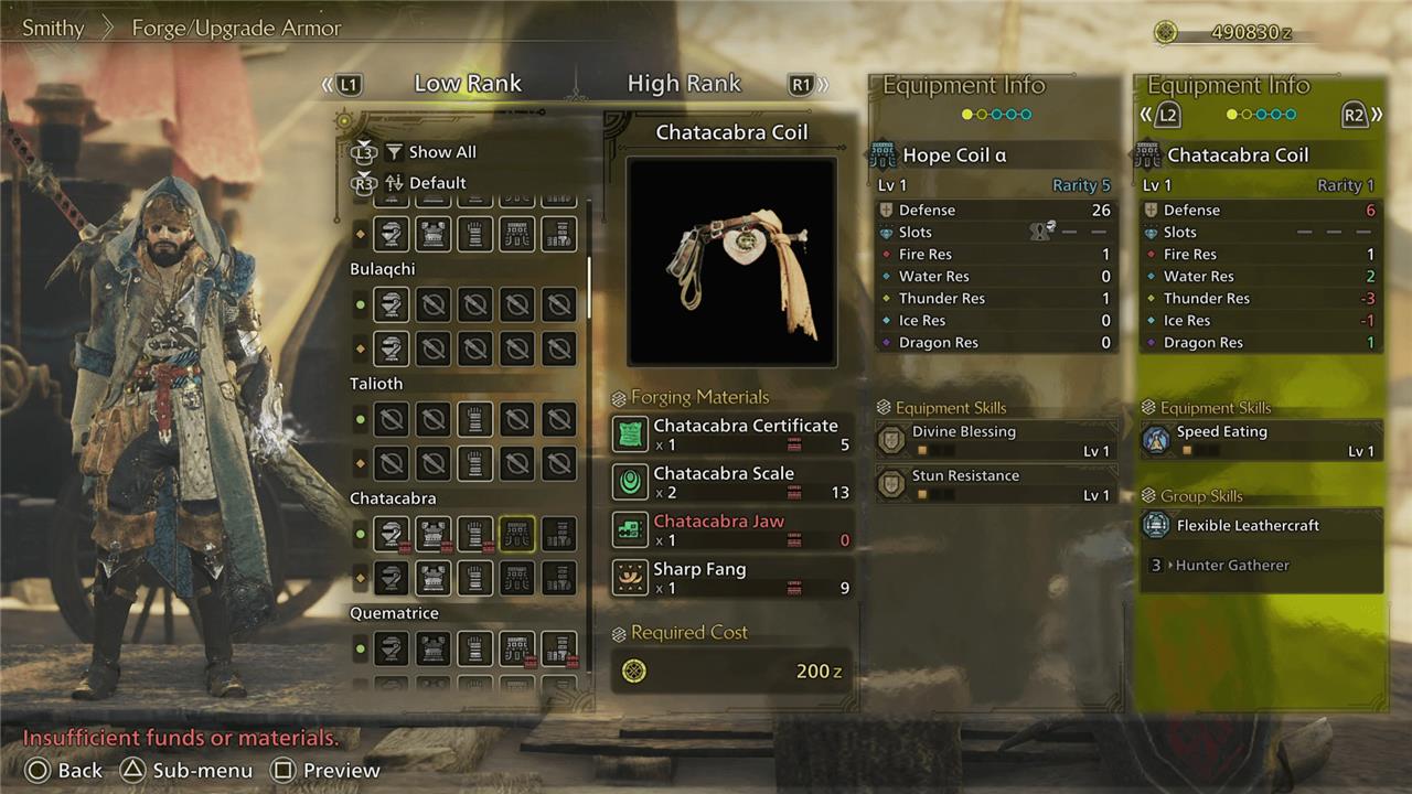 Both of these are low-rarity pieces that will give you a modest bump to your defense ahead of some of the more challenging monsters in Chapter 1 of the main story. The Chatacabra Coil specifically comes with some water resistance, which will be helpful when facing a Balahara in the Windward Plains or the most difficult fight in Chapter 1, the apex beast of the Scarlet Forest.