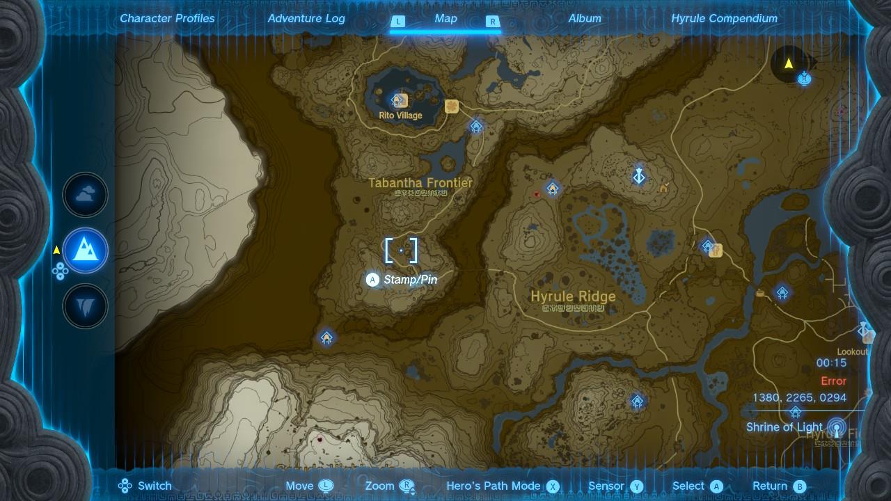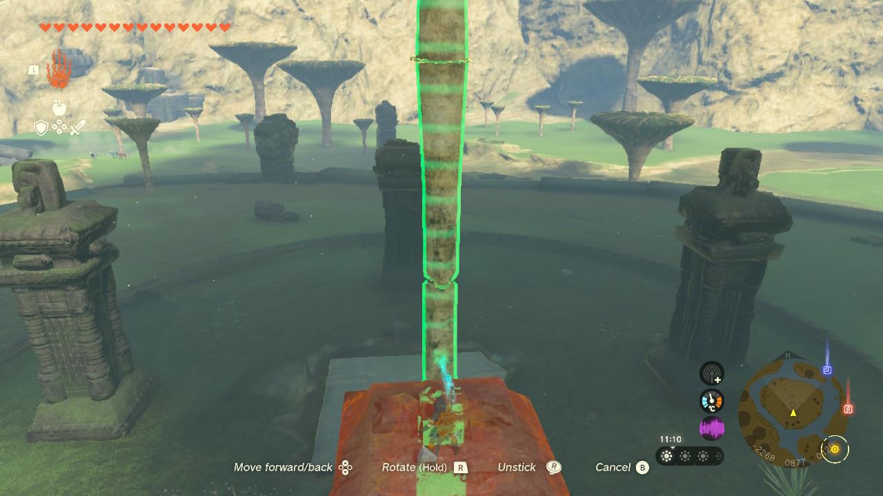 The riddle here reads: “On Hyrule Ridge, in Ludfo’s land, ruins sleep beneath the towering mushroom trees. Connect the southern column’s midday shadow to the northern. At the shadow’s center, the way to my treasure will open.”