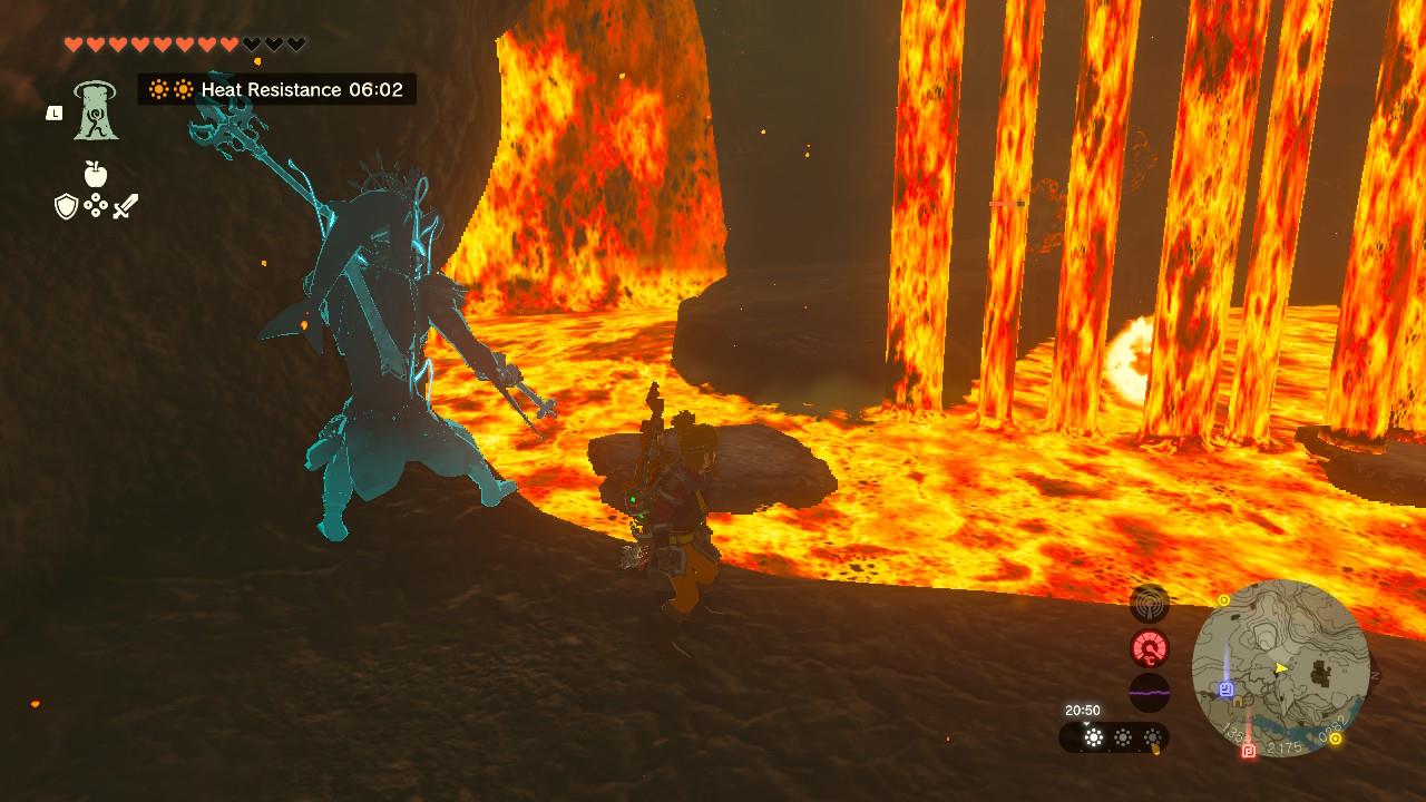 If you’re approaching from the west, along the ridge, you’ll have to fight a Flame Gleeok. Like other Gleeoks, this is a challenging fight. Use water-based attacks (Fuse with splash fruit or Chuchu Jelly arrows) to hit its heads, then attack it when it’s stunned.