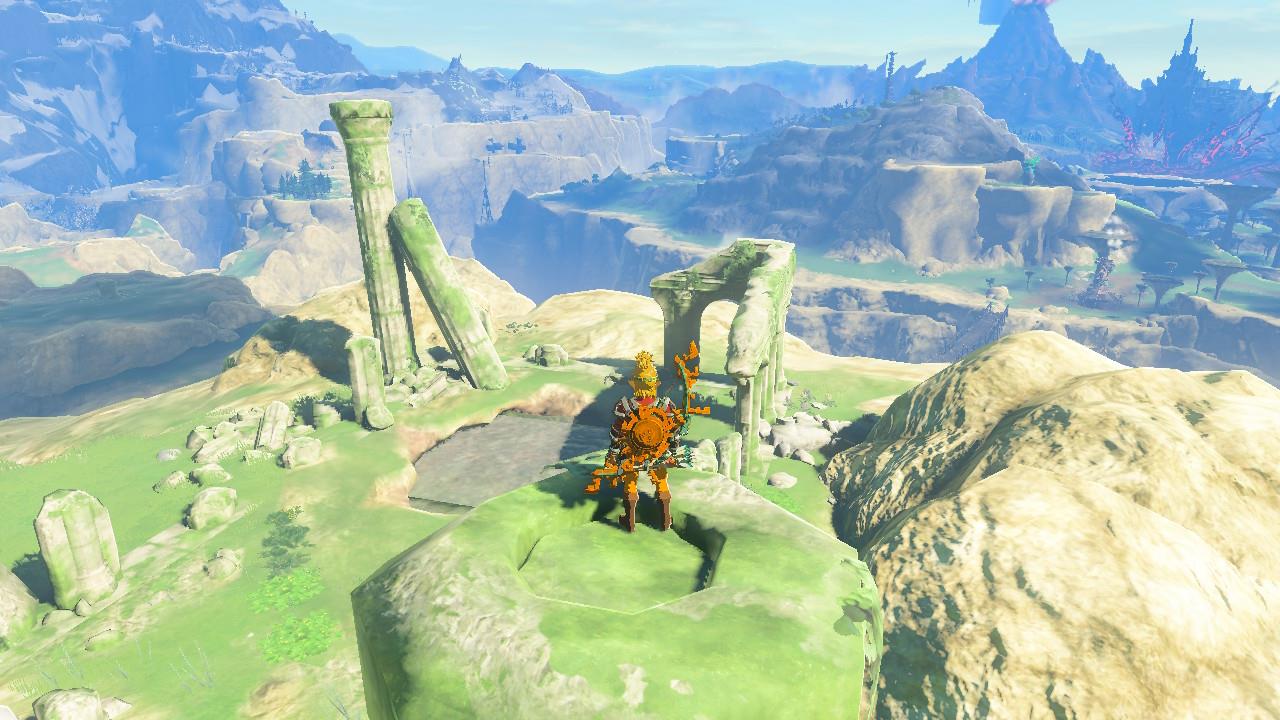 Approach from the east to avoid aggroing the nearby Flame Gleeok. Climb the pillar with a camouflaged pressure plate on top (around -3481, 0423, 0279), stand on it to reveal the Ancient Columns Cave entrance, then drop down and open the chest at the end (-3527, 0414, 0242).โ