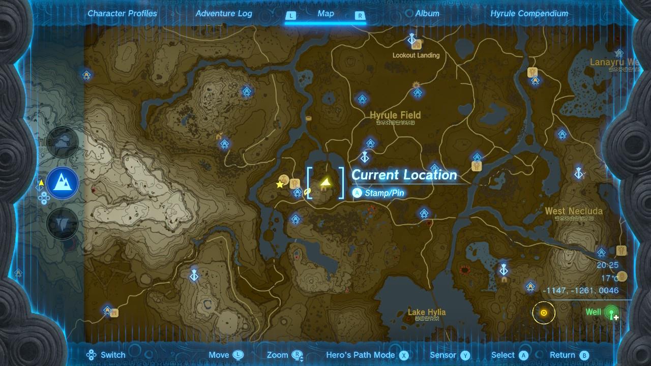 Warp to the Eldin Canyon Skyview Tower (1632, 12036, 0271) or Foothill Stable (coordinates around 0820, 1783, 0130) if unlocked, then head northwest on foot or horse along the main path through the Gerudo Highlands foothills toward Central Hyrule.โ
