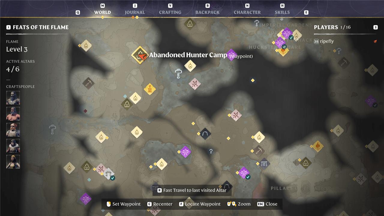 The hidden starting point for linen crafting in Enshrouded is the abandoned Hunter’s Camp, located north of the Ancient Spire fast travel point in the Revelwood biome. To access it, after unlocking the Revelwood Ancient Spire and starting the Hunter’s Hand Spindle quest, travel or glide north to this camp. The main entrance is on the western side of the map marker. Enter the cave, pass through the first room past the spiderweb, and proceed to the main cave room where the Hand Spindle glows red. Retrieving this Hand Spindle is essential, as placing it in your base allows you to craft linen from flax, the bright blue flower found throughout Revelwood.