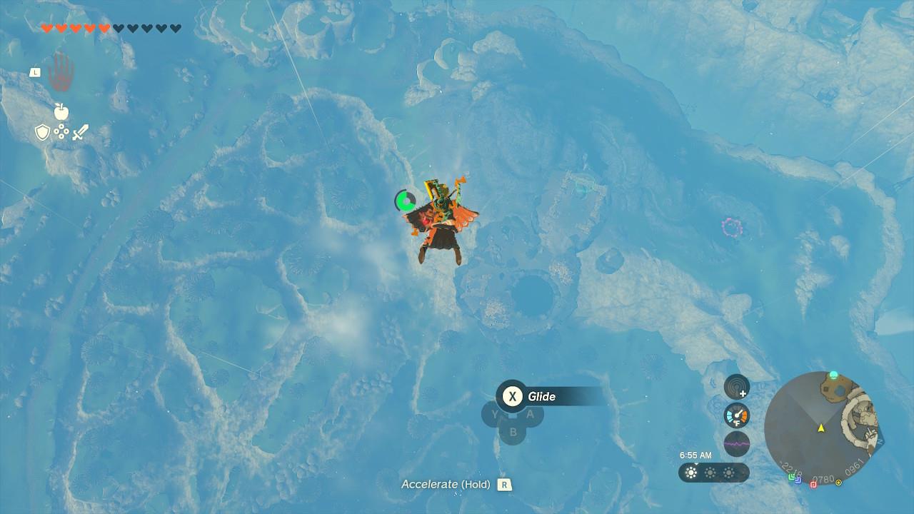 You can find the Glide Shirt on Courage Island at the coordinates (-2400, 0824, 0615), which is a sky island northwest of the Central Hyrule Sky. To get there quickly, Lindor’s Brow Skyview Tower is your best bet. Launch skyward, then glide southwest to the island below the rounded elevations on the side. As always, if you’re having trouble gliding for a long time, cook some stamina-boosting meals.