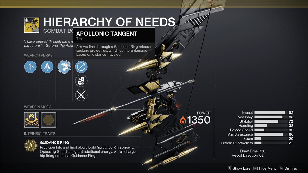 The Catalyst for the Hierarchy of Needs just makes it better, as it helps lower the draw time. The perk is called Protocol: Emergency Scramble. Deploying the Guidance Ring or striking targets with Apollonic Tangent arrows improves both draw time and reload speed for a “moderate” duration.