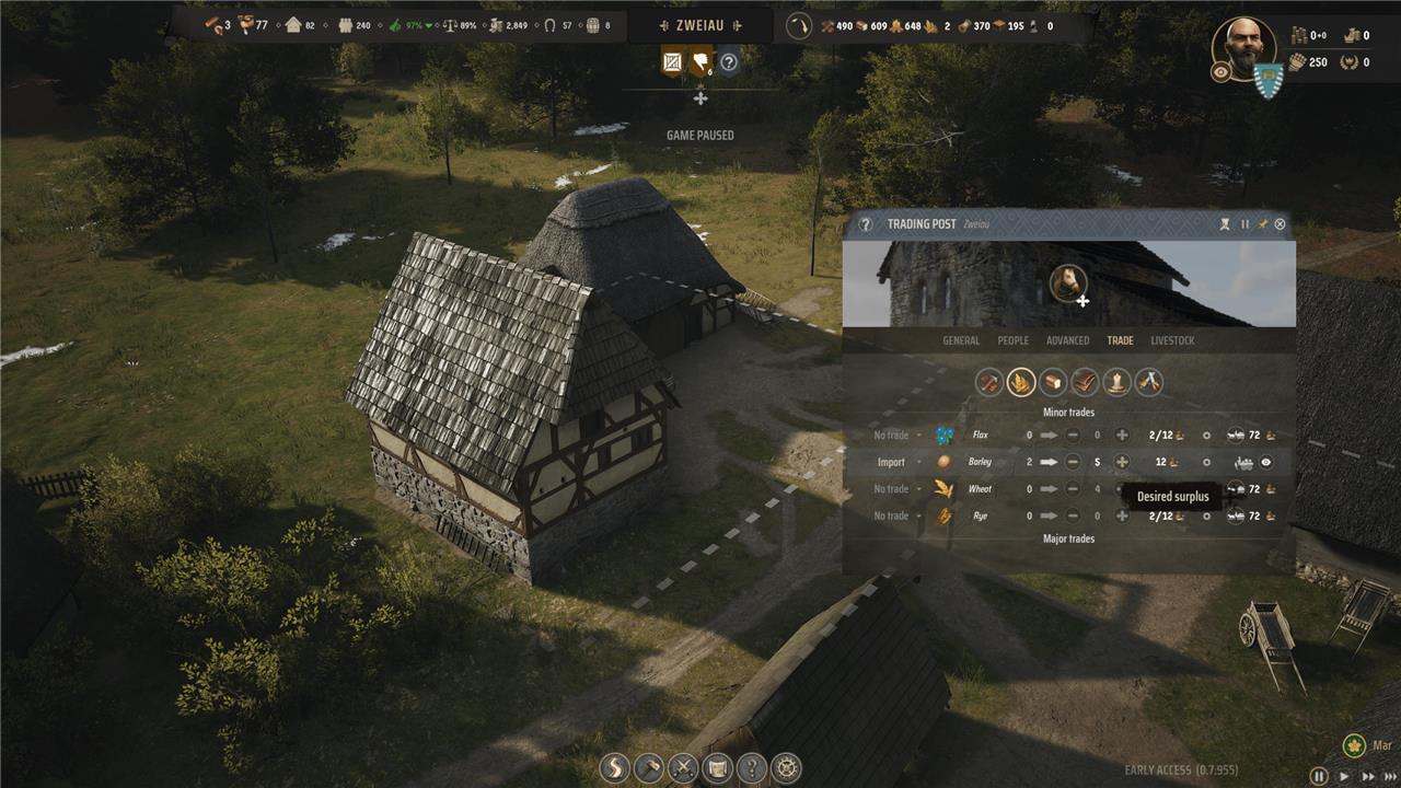 Sometimes, you’ll start your game of Manor Lords in a region with terrible fertility – barley seems especially fickle – and that means you’d have to put in a ton of extra work to get not enough barley. In cases like this, it’s time to import supplies through trade.