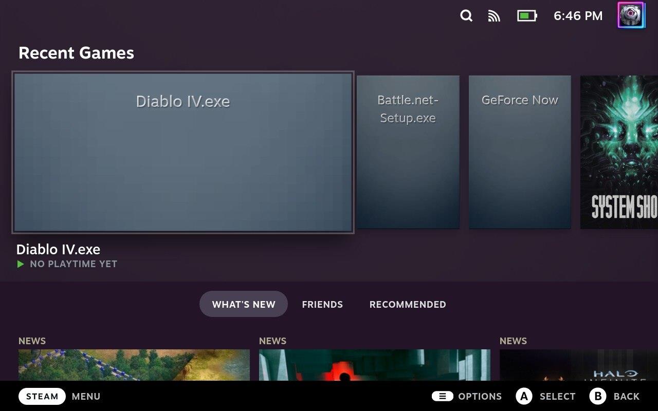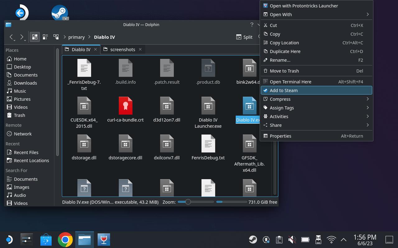 Open the file explorer we used earlier (the folder icon in the taskbar called Dolphin), then paste the destination into the bar at the top of the file explorer to quickly find where Diablo 4 is installed. Open the Diablo 4 folder, scroll down a little, and you should see a file called “Diablo IV.exe,” right-click on it (or, again, as an alternative, you can tap the left trigger), and select “Add to Steam,” just like we did with the Battle.net installer.