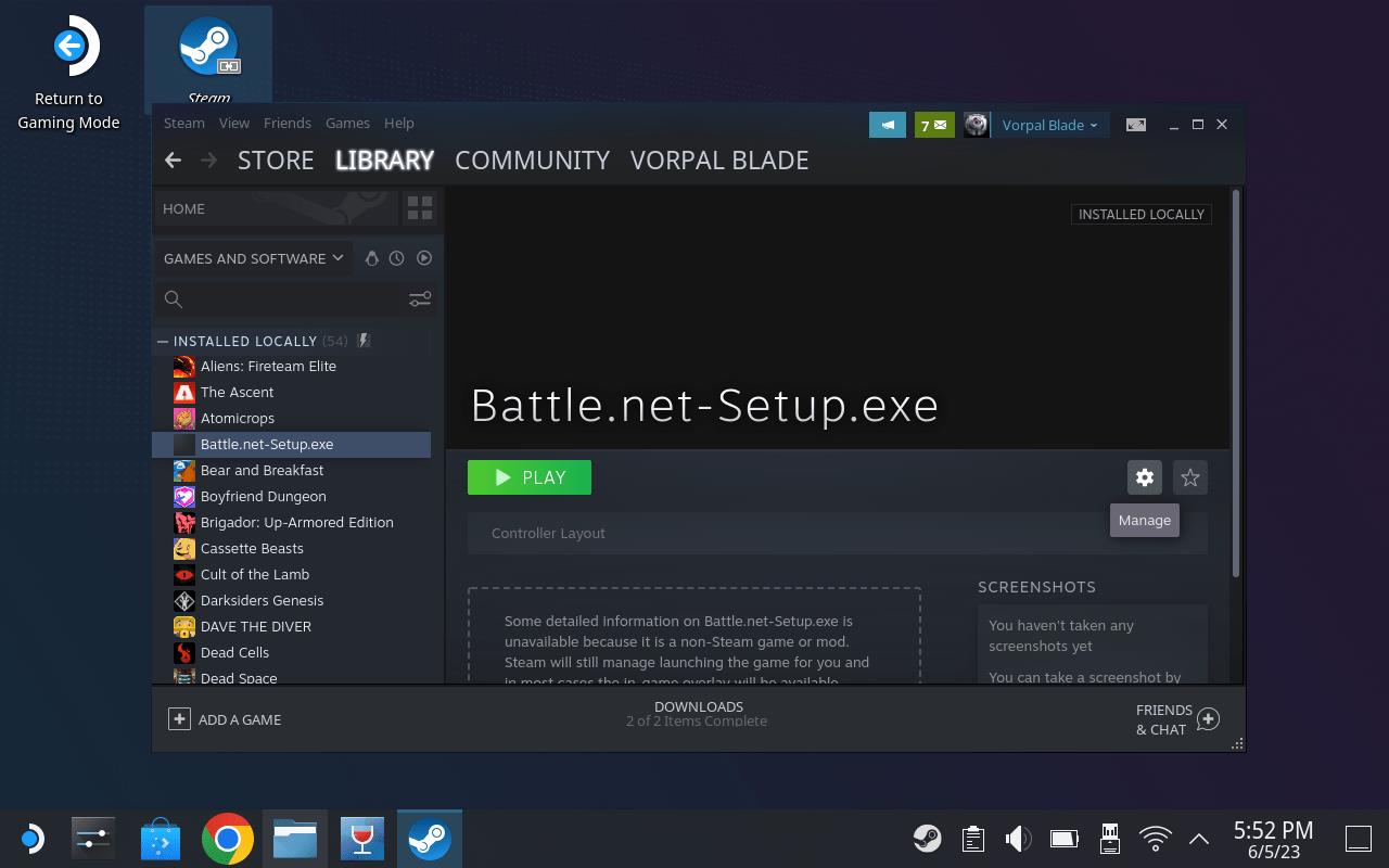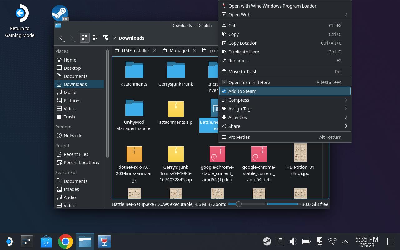 After the file has been downloaded, open your downloads folder by clicking the file explorer (the folder icon on the taskbar called Dolphin). If you have a mouse connected, right click the file “Battle.net-Setup.exe,” or pull the left trigger that mimics the right click action. Then, in the drop-down menu, click the option that says “Add to Steam.” You may see a pop-up from Steam that asks you to add a non-Steam game. If so, simply tap “Browse” on the lower left corner, then select the installer in your downloads folder.