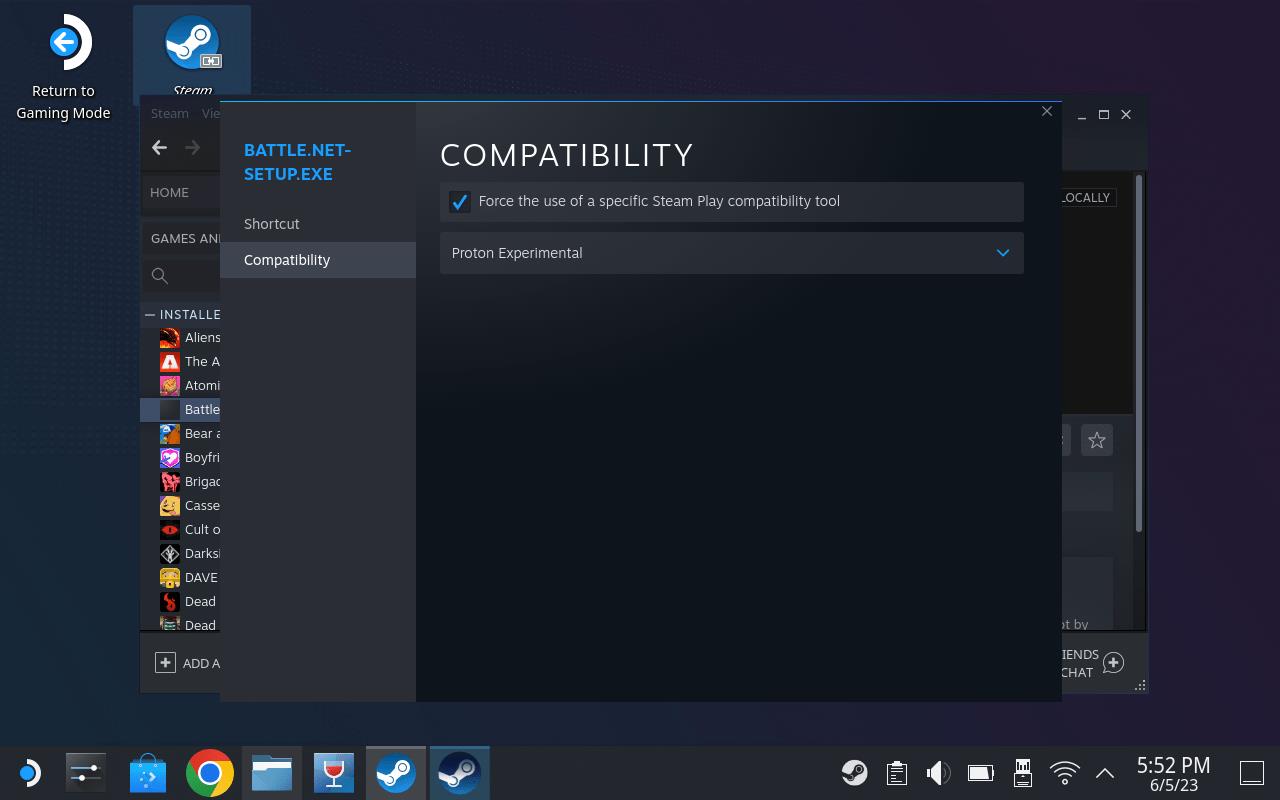 Now, head back over to the Steam app, and you’ll find that file (Diablo IV.exe) in your library. Like before, you’ll want to change the compatibility to “Proton Experimental” using the same steps we outlined earlier for the Battle.net installer.