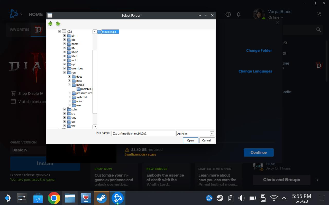 Run through the Battle.net installation as you would on your desktop. By default, the installation will happen on your onboard storage, but alternatively, you can store the app and your games on a microSD card by changing the save destination. On my Steam Deck, it’s nested within the “Z” directory. After clicking into that, expand the “run” folder, then the “media” folder. Lastly, you’ll click the name attached to your microSD card. In our case it’s “mmcblk0p1.” If you mess up at this stage, simply delete the installer from your Steam library, and start the process over.