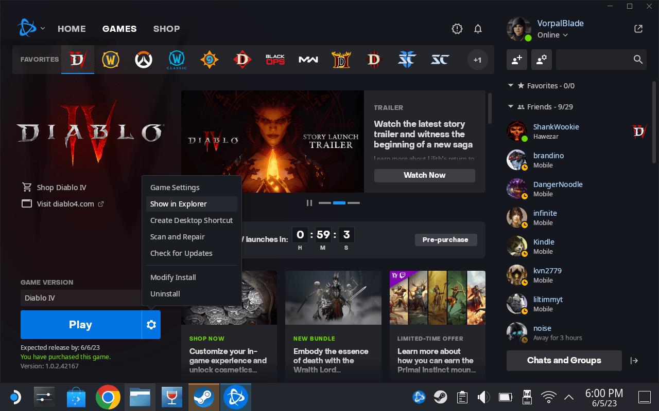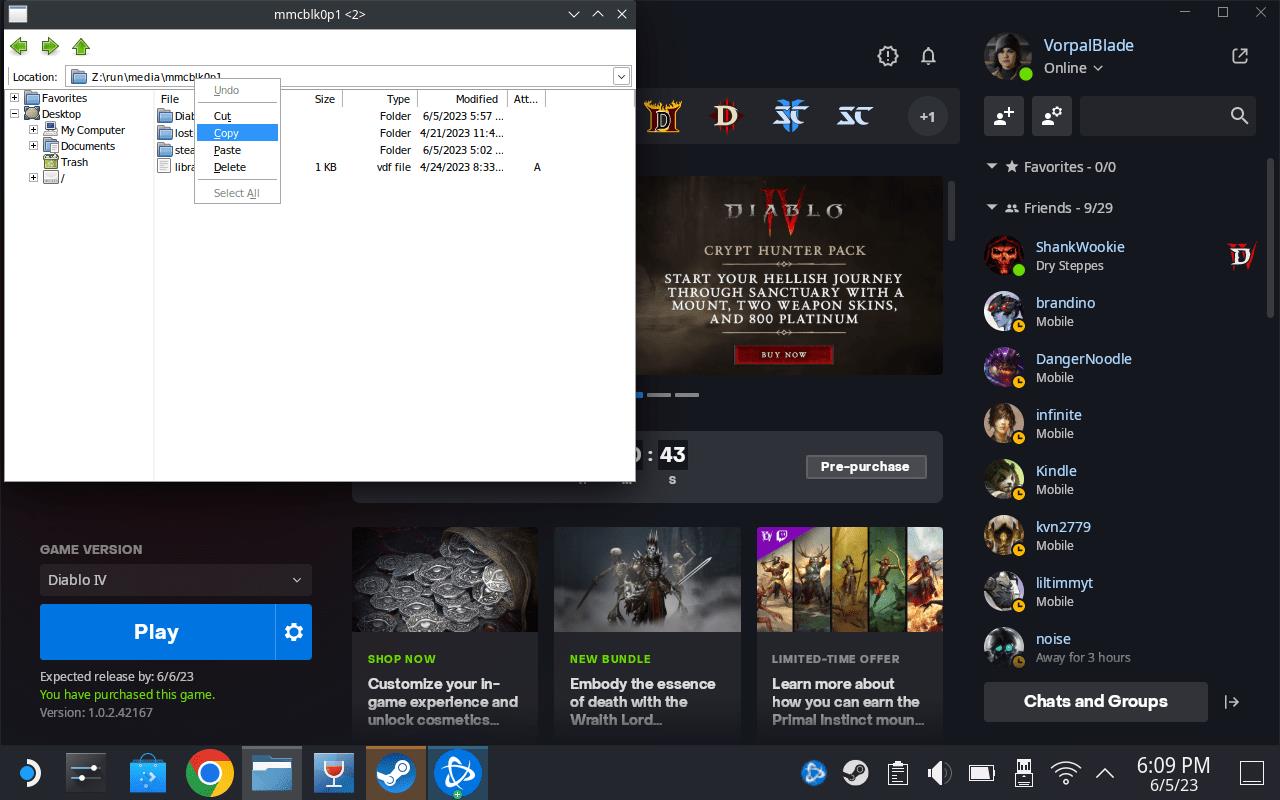 Almost done. With Diablo 4 installed in Battle.net, click the settings icon next to the blue “Play” button, then select “Show in Explorer.” This will open a small window that contains the game’s files. Copy the destination directory by highlighting the text in the bar, right clicking it, and selecting “copy” (in our case, it’s Z:runmediammcblk0p1Diablo 4), then go to your desktop.