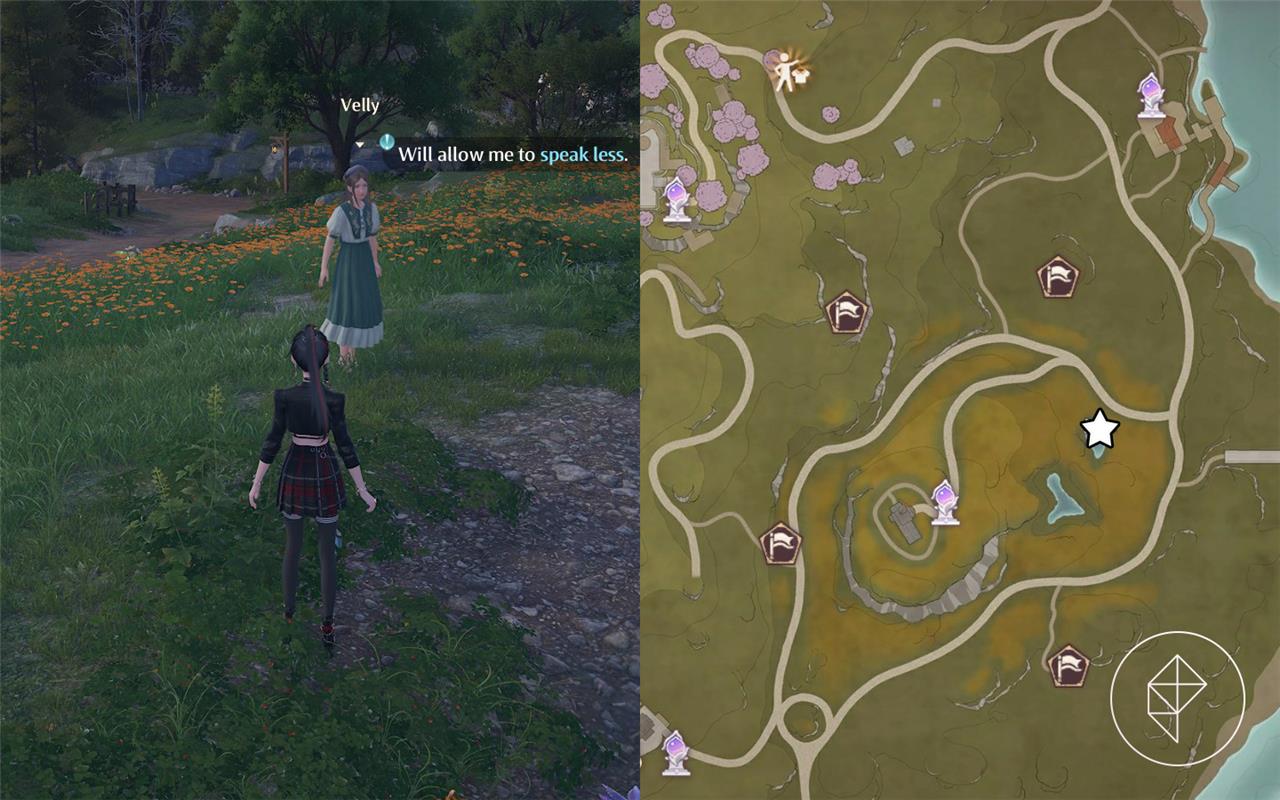 You can find Velly near the ponds east of the Bug Catcher’s Cabin, at this exact location:
