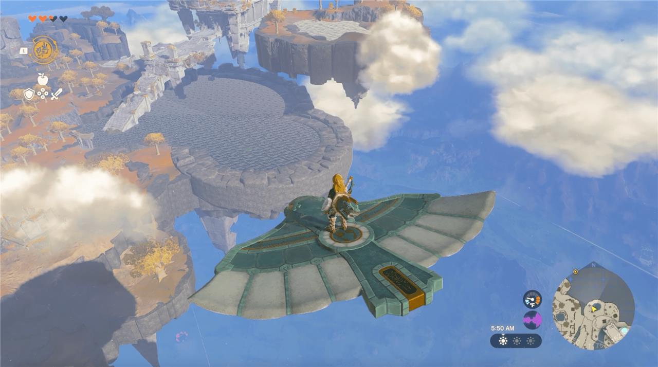 The “proper” method is to use your Ultrahand ability and slot the wing into the rails you see to your left. You can then hop on and ride it off the ramp; simply standing on it will cause it to go, at which point you can glide the rest of the way to the Temple of Time on the far side of the Great Sky Island.