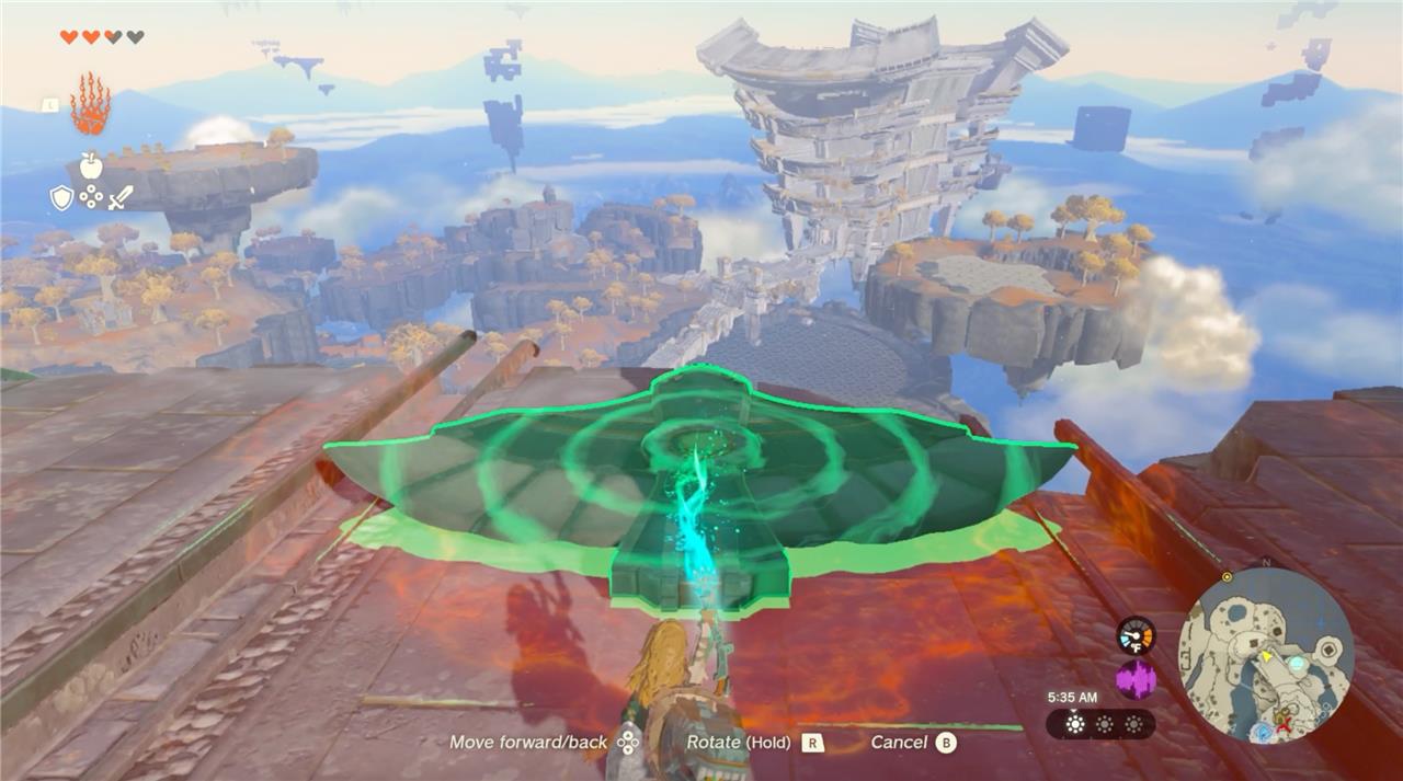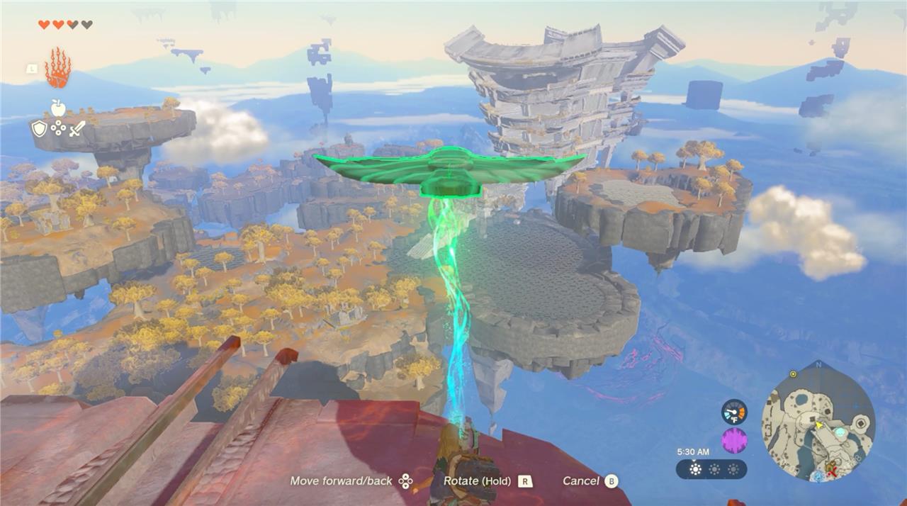 Use the Zonai wing glider by placing it on a launch rail or flat surface, then activate it with a fan, rocket, or by running off a high platform. Balance Link near the center to keep the wing stable as it glides through the air. To reach the Temple of Time, launch from a nearby Sky Island facing its direction, adjusting your speed and altitude with fans if needed. Watch your stamina and distance, as wings disappear after a while, so plan your flight path carefully to reach the temple safely.