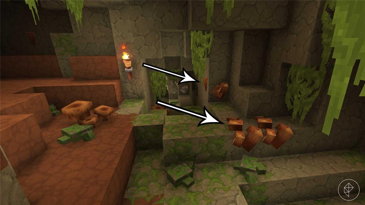Copper ore appears as shiny brown protrusions on cave walls and ceilings in Hytale. Enter natural caves through chasm-like openings visible on the map or find mineshafts near pits to reach these areas quickly. Use a crude pickaxe to mine the ore from stone, with each rock dropping two pieces. Check zones like Emerald Winds and Howling Sands where copper spawns commonly alongside iron.