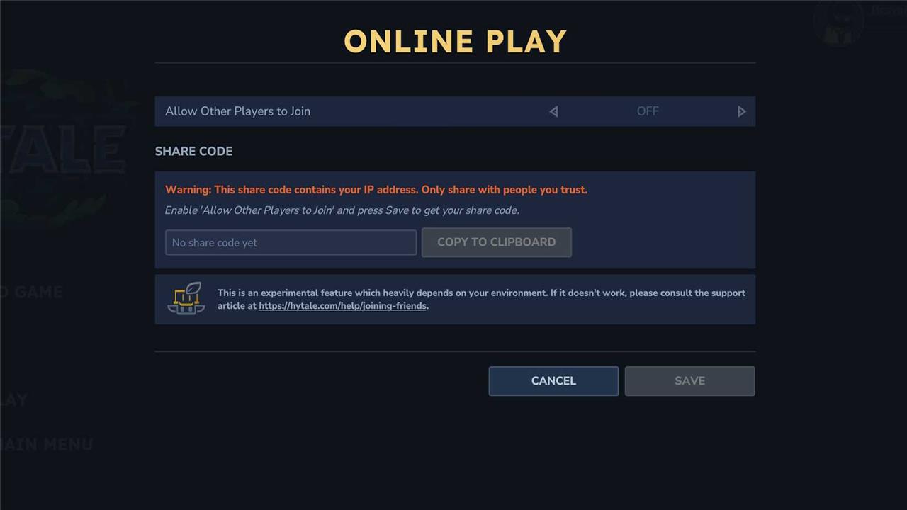 Enter your world, press ESC for the pause menu, and select “Online Play.” Toggle “Allow other players to join” on, optionally add a password (which can embed into the code), then click Save to auto-generate the share code-copy it from the field.