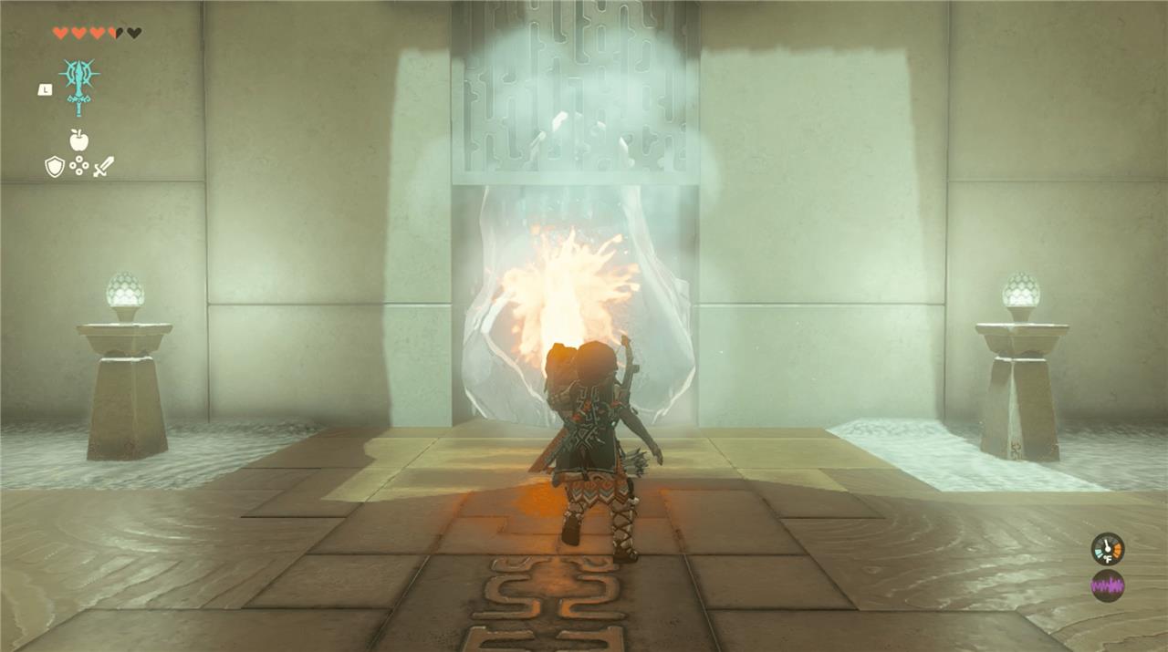 1. Walk forward into the shrine and defeat the Construct on your right. It will drop a flame emitter shield. Pick it up and equip it.