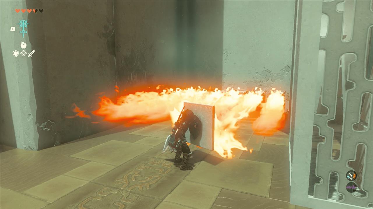 5. Grab the stone-slab shield and equip it. Then walk toward the line of flamethrowers in the room. As you approach the flamethrowers, hold out your shield – as if you would defend against an enemy – and use it to block the flames so you can safely walk through to the next area.
