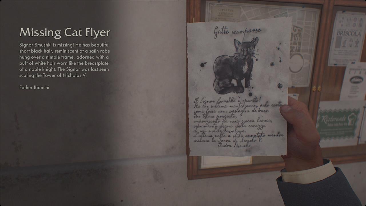 To start the “A Free Spirit” mystery in Indiana Jones and the Great Circle, head to the Tower of Nicholas V in Vatican City. Across the street from the tower entrance, you’ll find a bulletin board with a Missing Cat Flyer pinned to it. Interact with this flyer to begin the quest, which involves finding and photographing a missing cat named Signor Smushki. Before starting, make sure to obtain the camera from Ernesto inside the Vatican Post Office, as it is essential for taking the required photo. Once you have the flyer and camera, you can begin your search for the cat near the rooftops around the Tower of Nicholas V.