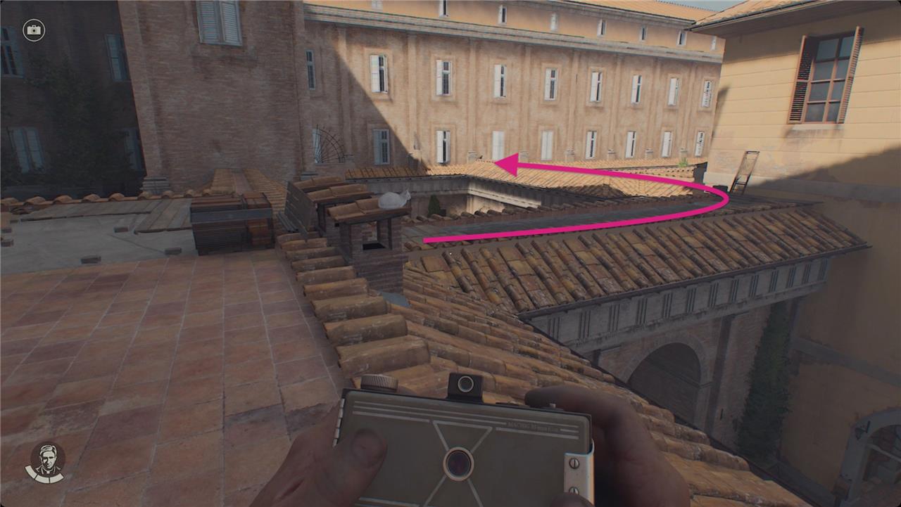 Signor Smushki, the elusive black cat with a tuft of white fur on his chest, is hiding on the rooftops above the garden area leading to the Vatican Museum in Indiana Jones and the Great Circle. To find him, start from the Tower of Nicholas V and navigate through the rooftops past the white cat near a trio of tiny chimneys. From there, turn right across a narrow rooftop, then left across another narrow roof. At the far wall above the entrance to Belvedere Courtyard, you will spot Signor Smushki resting near the wall between two windows. Snap his photo to complete the quest and earn 100 Adventure Points.