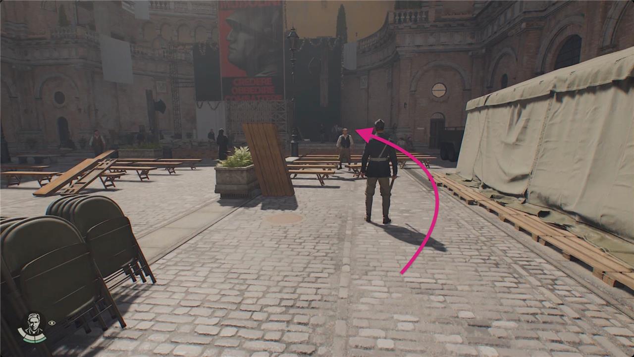 The Blackshirts are building a stage at the end of the courtyard. Head around to the right side, and then sneak behind it. Use your whip to the climb the scaffolding, take a left (and punch the fascist waiting for you), and then climb more scaffolding.