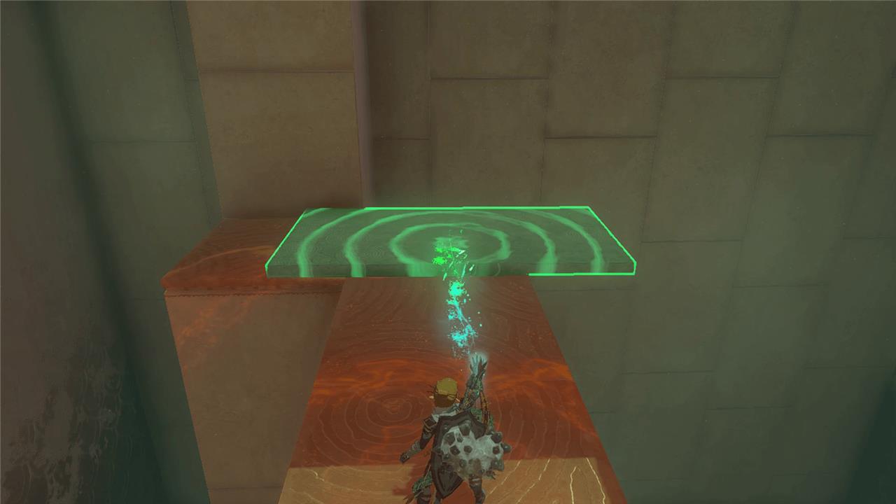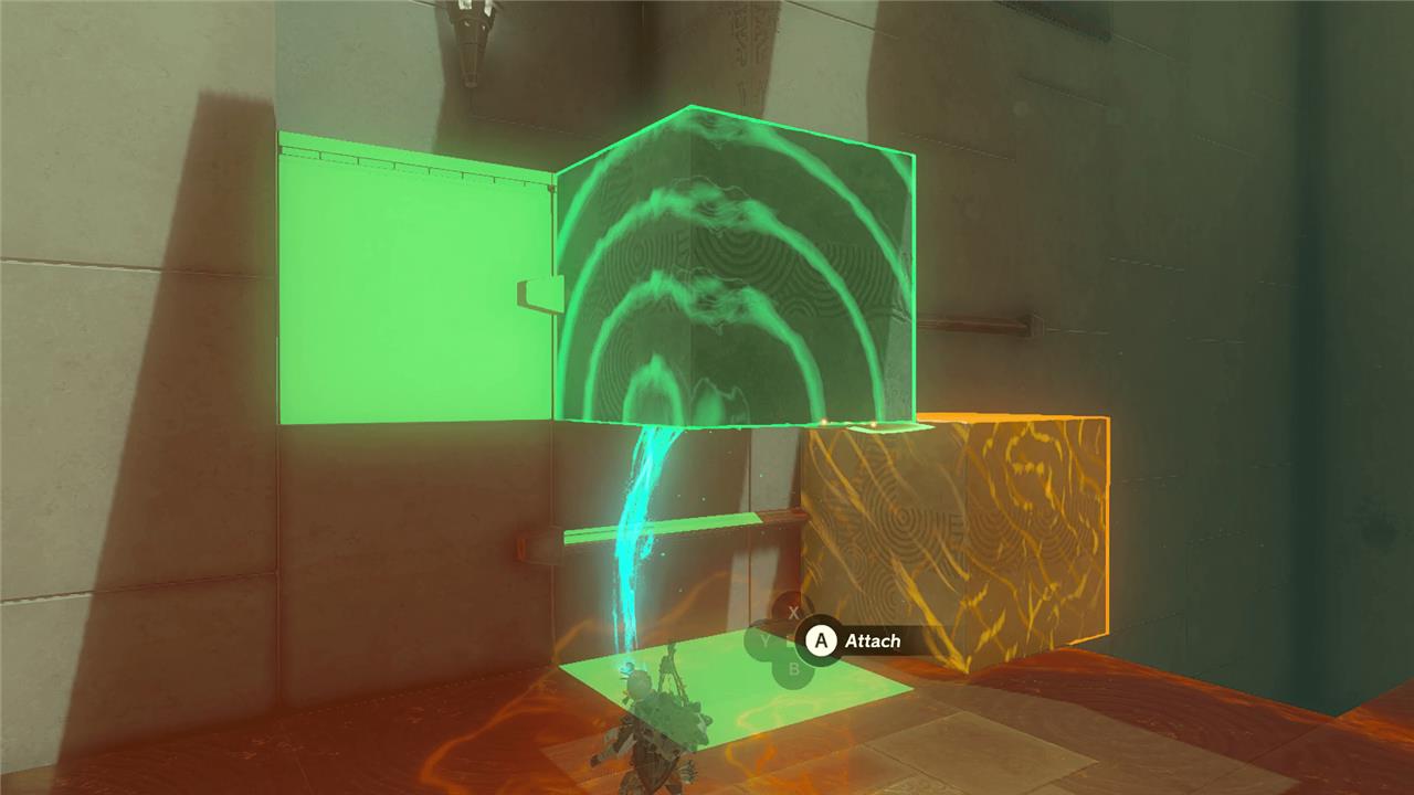 2. Pull the big square on the rail closer to you using Ultrahand, so you can jump down to it. Then pull the cube above it close enough for your to again, Ascend through and climb up another ledge.