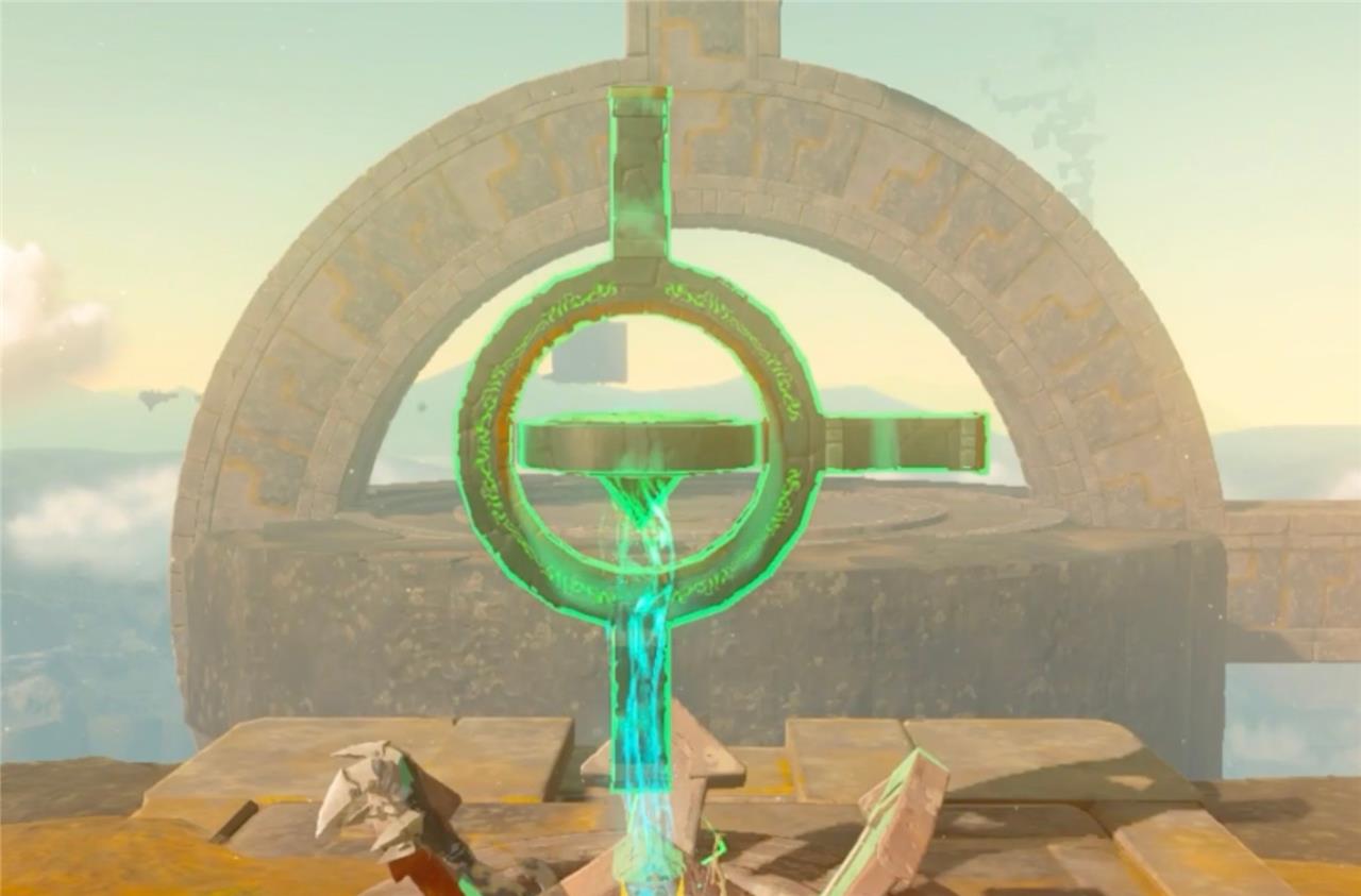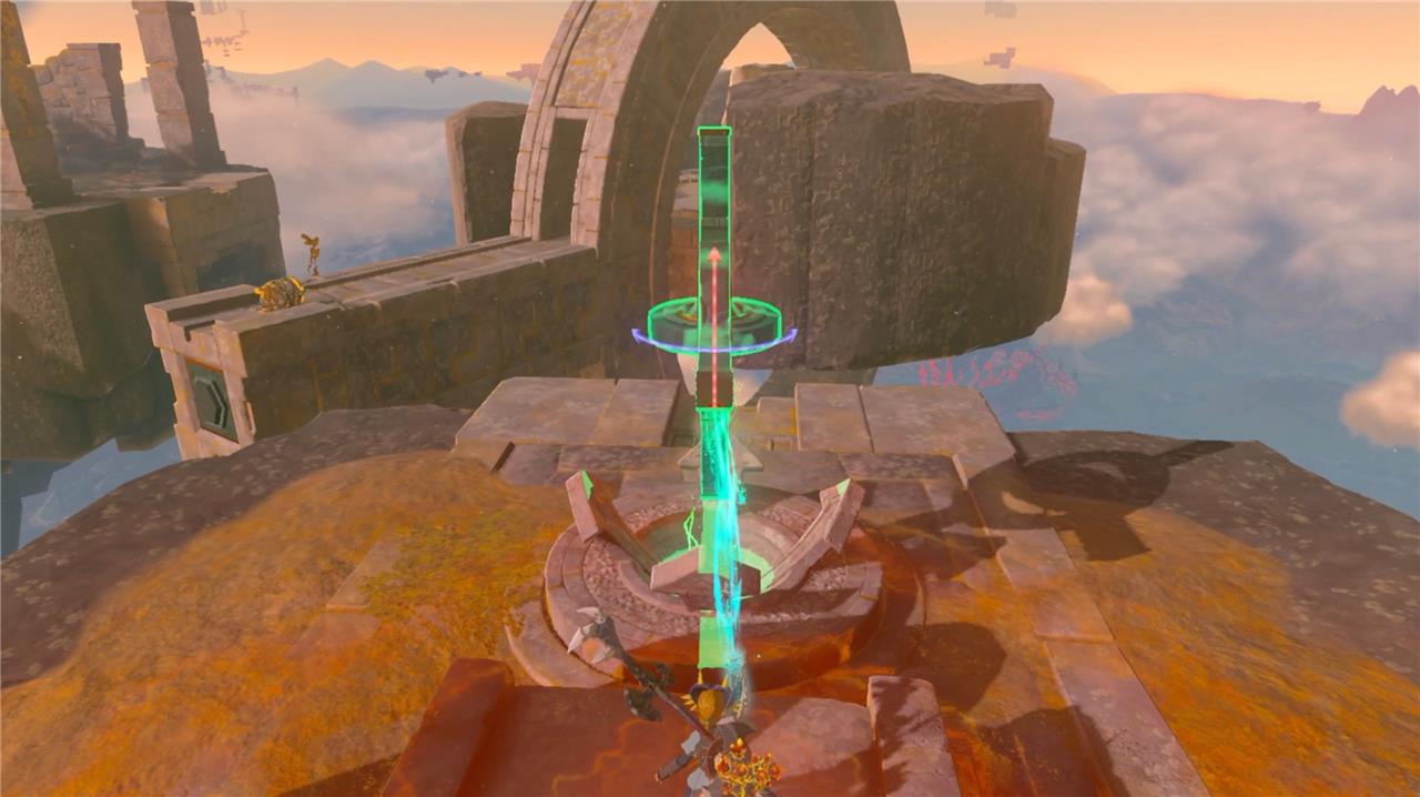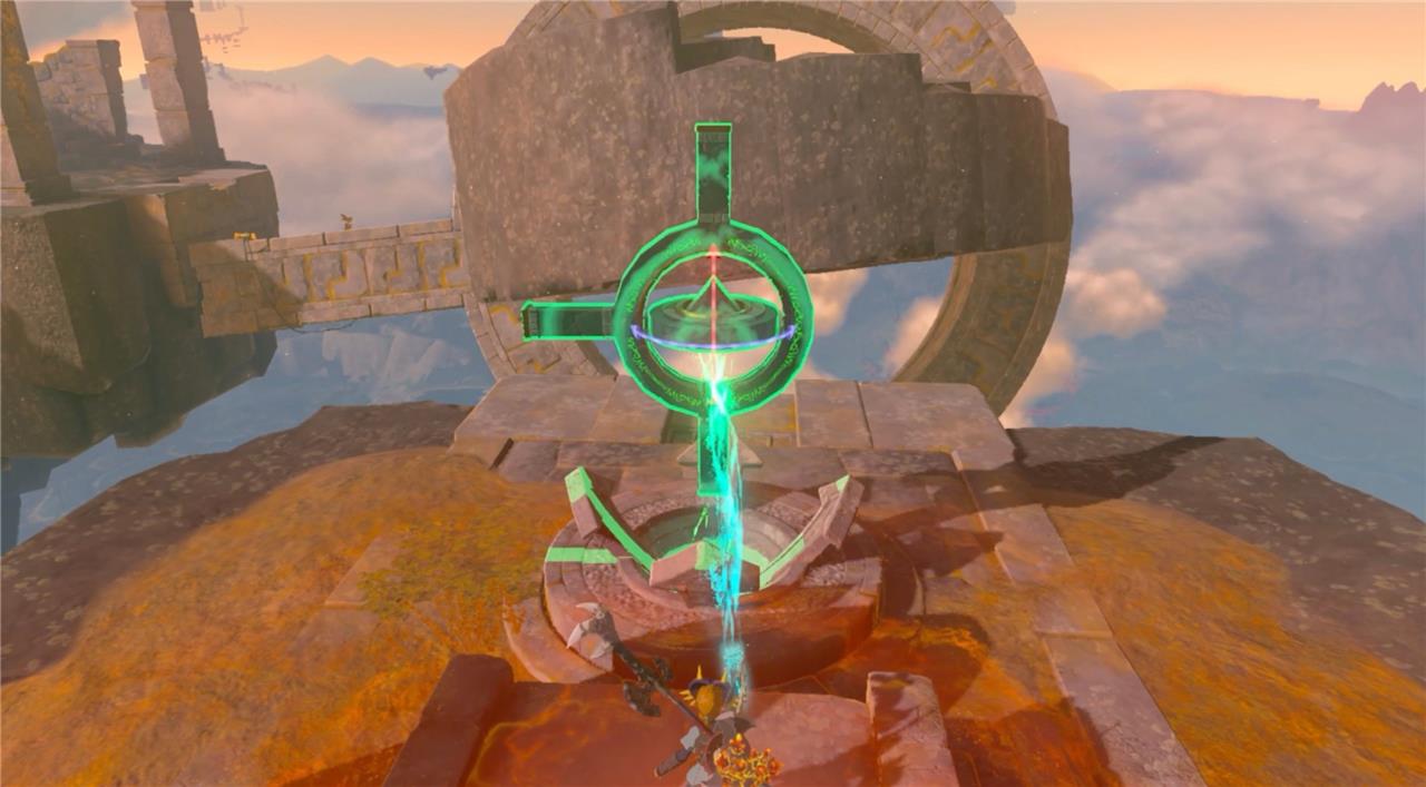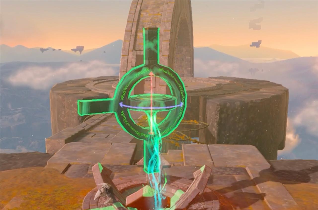 1. Walk to the left of the shrine to find a rotating Zonai switch that controls a massive stone bridge. Use Ultrahand to rotate the switch 180 degrees to the right on the X axis, then 180 degrees up on the Y axis. The ledge should click into place on the platform across from you and reveal a chest on a rope.