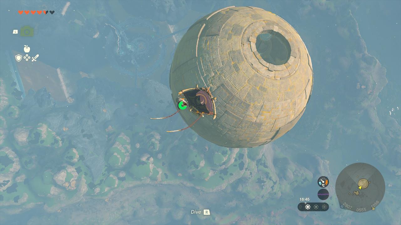 First, make your way to the Skyview Tower and launch yourself. Once you begin your descent, look for the definitely-not-a-Death-Star due southeast (it’s really hard to miss) and make your way over to it. There is a hole directly on top of it, leading to the shrine. Don’t worry if you mistime your landing – as long as you stay right on top, you can jump in the hole when it’s there.