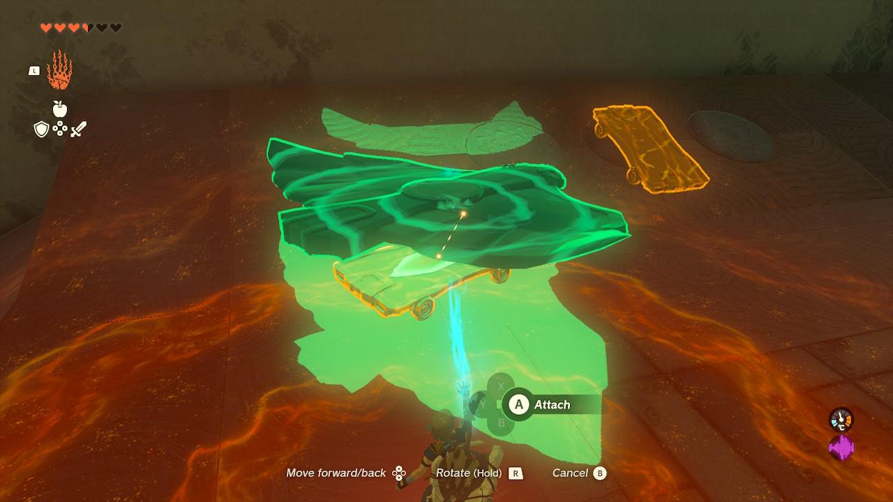 Enter Jirutagumac Shrine on the western edge of the Gerudo Highlands at coordinates (-1637, -1530, 0383). Activate the nearby stone slab with Recall to reveal a hidden passage across the gap, then drop down to the main chamber. Glide to the lower platform and use Ultrahand to attach the loose metal block to the rail, riding it upward to strike the target switch. This opens the path forward; repeat the process with the second rail block to access the final room. Fuse a stone slab onto your shield or arrow to hit the glowing switch, claim the chest with a Large Zonaite, and touch the altar for the Ascend ability.