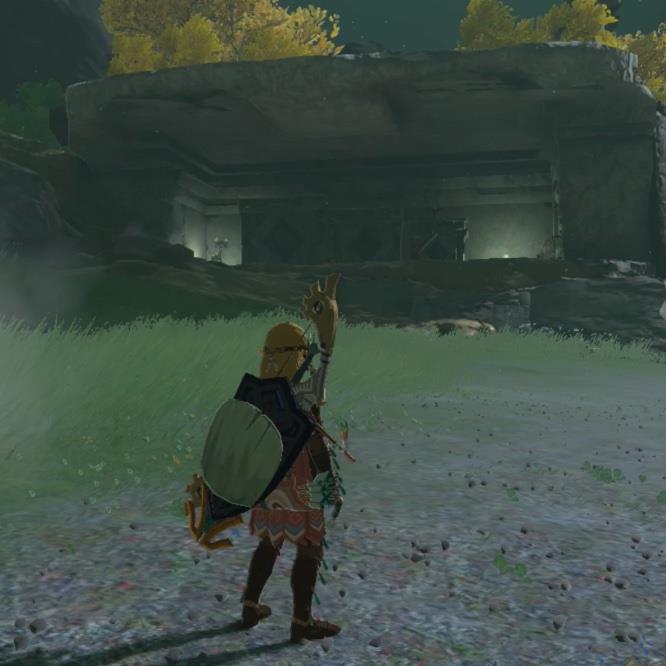7. Once all three stone slabs are down, a green crystal will manifest in the air above the temple and create the shrine. Run out of the temple to the dirt hill to the right to find the Jochisiu Shrine sitting above among the trees.