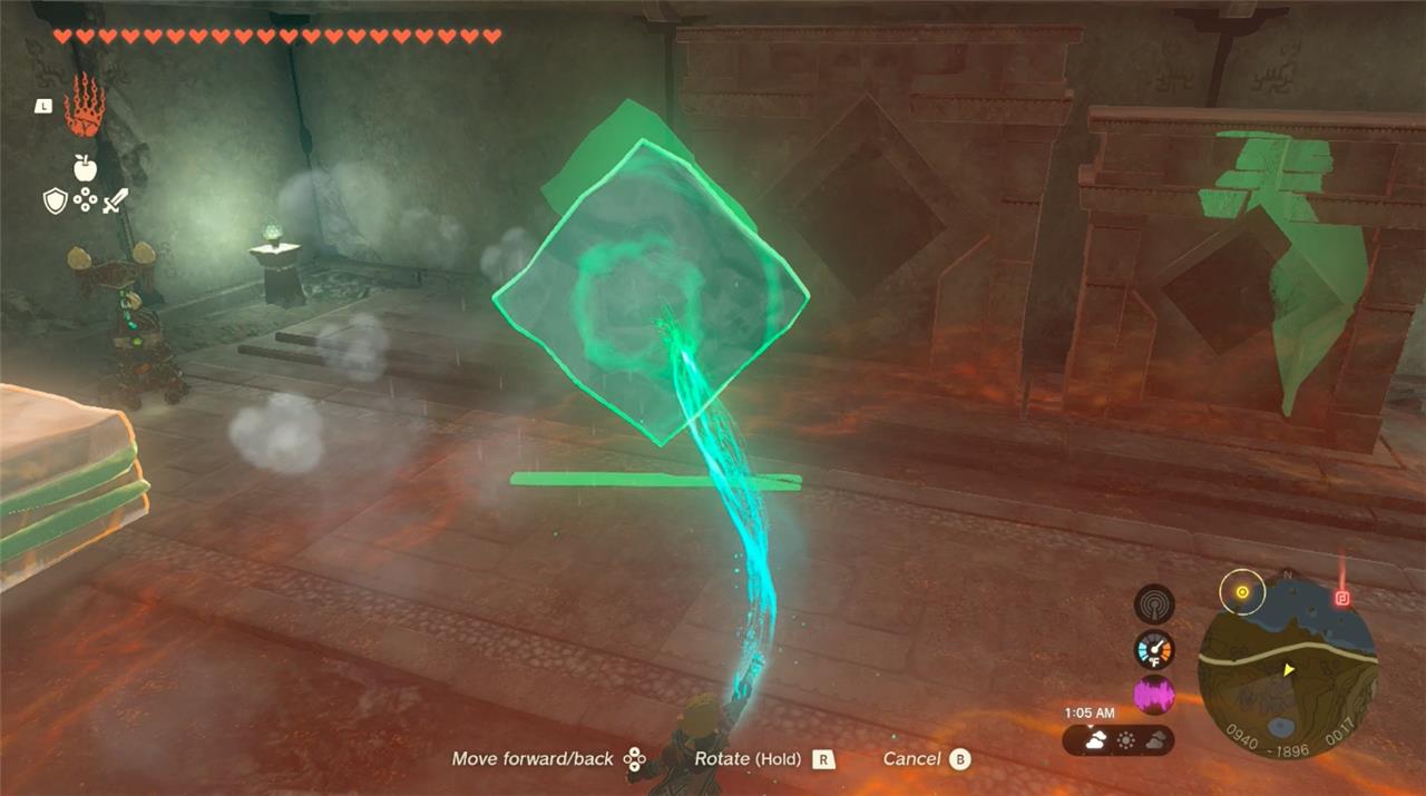 3. Once by the river (the shallow cove next to the fallen Zonai arch is a good spot), set down and activate the frost emitter. Use Ultrahand to lift up the frost emitter above the water and position it pointing downward. Blasting the frost air at the water will create floating ice squares. Create a bunch of them, then for ease of transport, use Ultrahand to attach them all together. Bring the stack back to the temple.