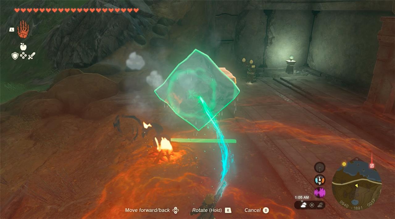 5. Next, find your flame emitter and use it to light up the extinguished campfire in the center of the temple. When the flame is burning, use Ultrahand to grab and vertically position the next sheet of ice. This sheet is too big to fit in the next diamond hole, but hold it over the fire for a second or two to melt it down. When sized correctly, it’ll click right into and unlock the second diamond-holed slab.