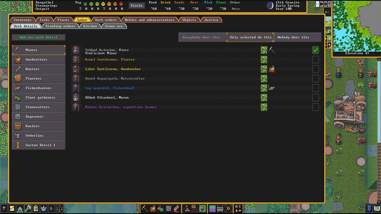 Labors are grouped in broad categories like Miners, Woodcutters, and Haulers. For each category, you’ve got the option to let anyone pick up a job (Everybody does this), select the dwarves that do it (Only selected do this), and forbid any dwarf from doing it (Nobody does this).