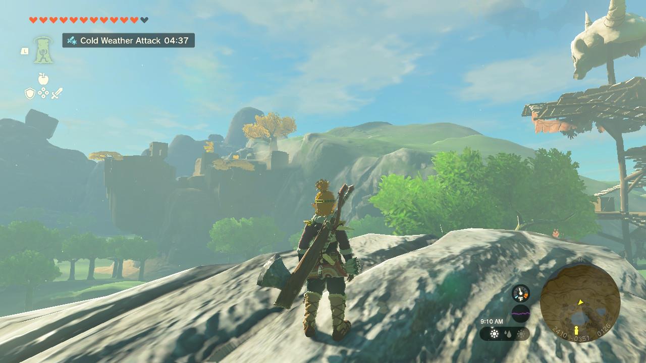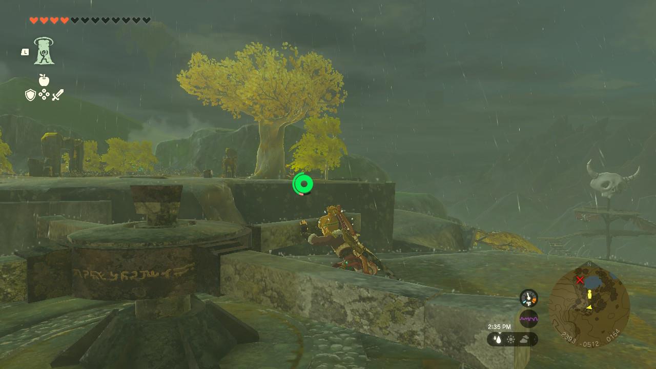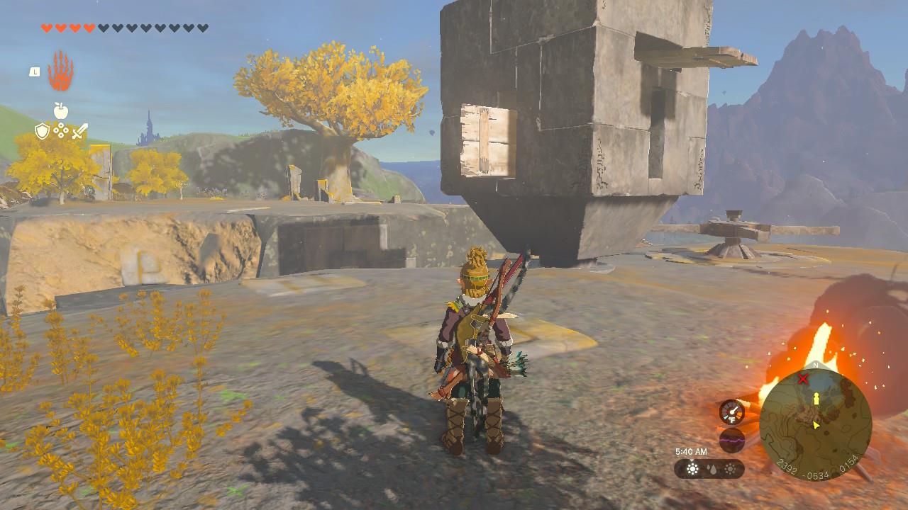 You won’t see the glowing green shrine topper that’s normally marking shrine locations, however. This shrine will stay hidden until you’ve solved the “Dyeing to Find It” puzzle. Instead, you could look for a large skull denoting a bokoblin lookout. Looking southwest from that area, you’ll see a some yellow trees on rock edge. There’s a big, square-shaped block that’s key to the Kurakat Shrine. Head over there.